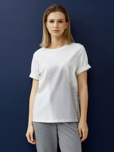 Футболка прямого кроя с абстрактным принтом. Овальный вырез горловины, короткие втачные рукава с отворотом. Футболка – базовый вариант верха, можно носить навыпуск или заправлять в брюки, юбку, использовать как самостоятельный верх или надевать под жакет.