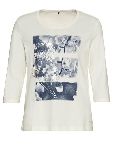 Белая футболка с романтичным принтом. Широкий овальный вырез горловины, прямой силуэт. Втачной рукав ¾. Футболка хорошо сочетается как с брюками или джинсами, так и с юбкой.