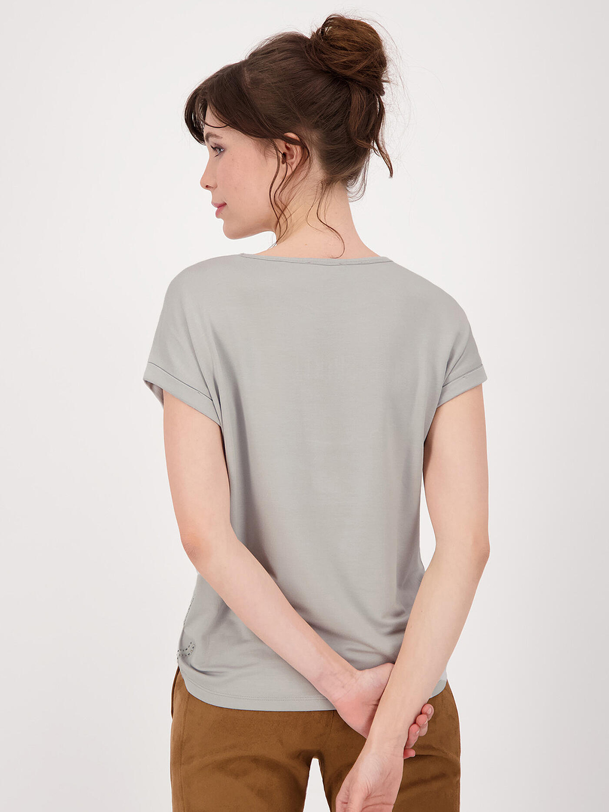 Однотонная футболка прямого кроя с оригинальным принтом на груди. Цельнокроеный короткий рукав, овальный вырез горловины. Футболка – универсальный элемент гардероба, можно носить как заправленной, так и на выпуск, сочетать с жакетом или кардиганом, а также использовать как самостоятельный верх.