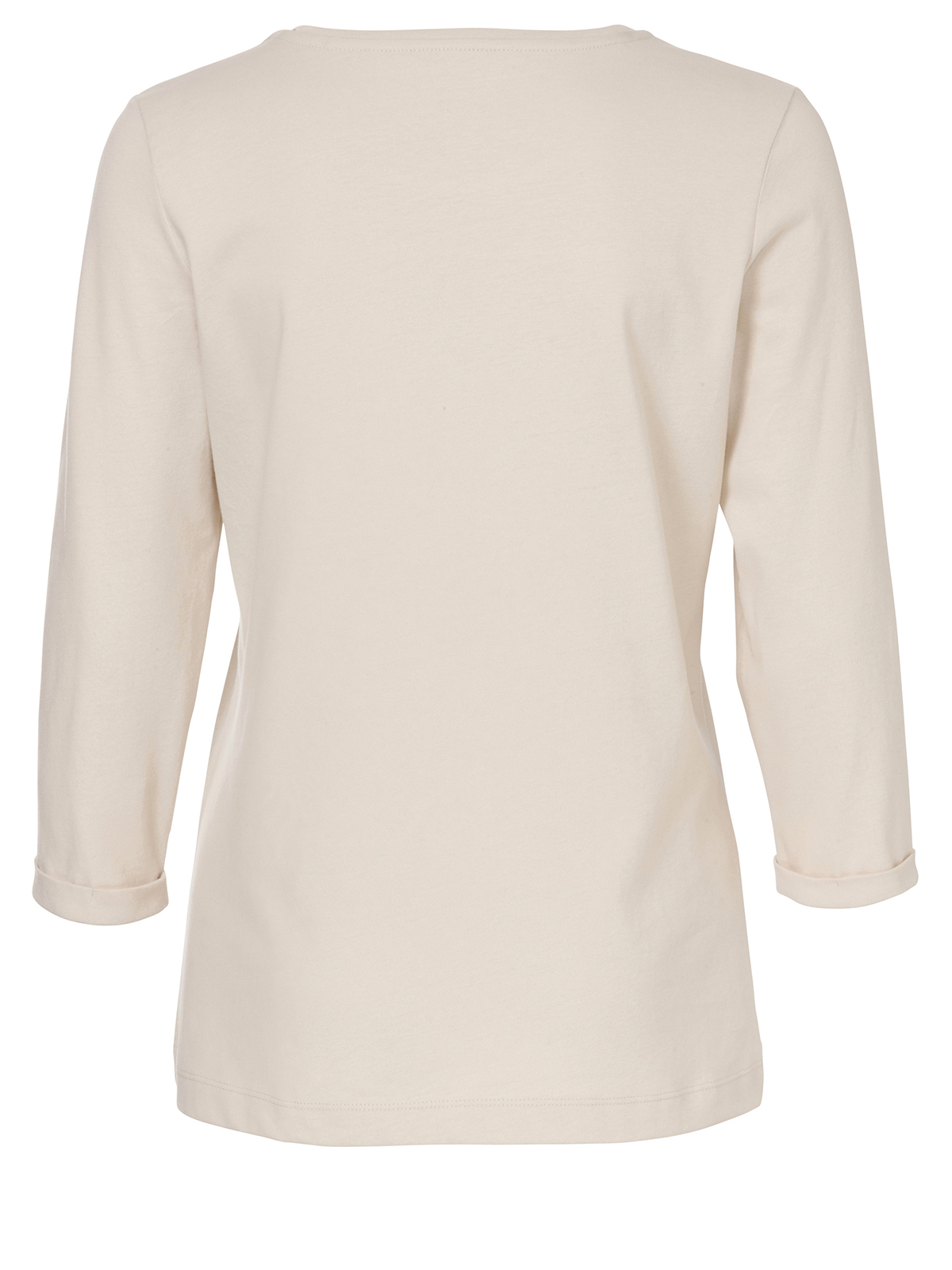 Бежевая хлопковая футболка с рукавом 3/4. Базовый элемент гардероба любой женщины. Футболка универсальна, может выступать как самостоятельный верх или надеваться под жакет , кардиган или блейзер. Натуральный материал приятен к телу и комфортен в ношении. Круглый вырез горловины, втачной рукав. Футболка декорирована бусинами на груди.