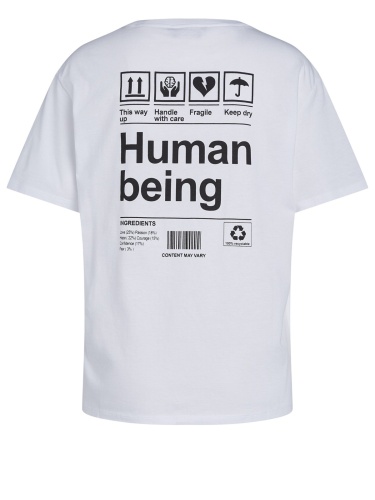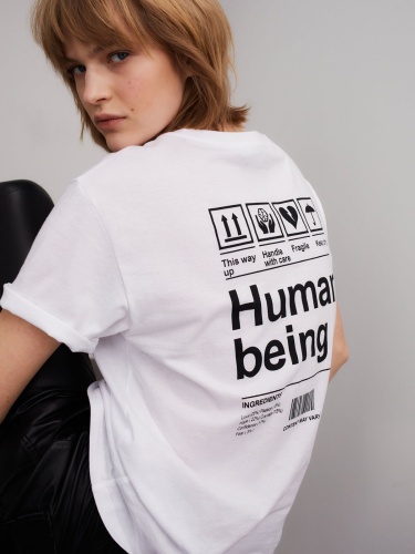 Белая хлопковая футболка с оригинальным графическим принтом на спине. Прямой силуэт. Короткий втачной рукав, круглый вырез горловины.