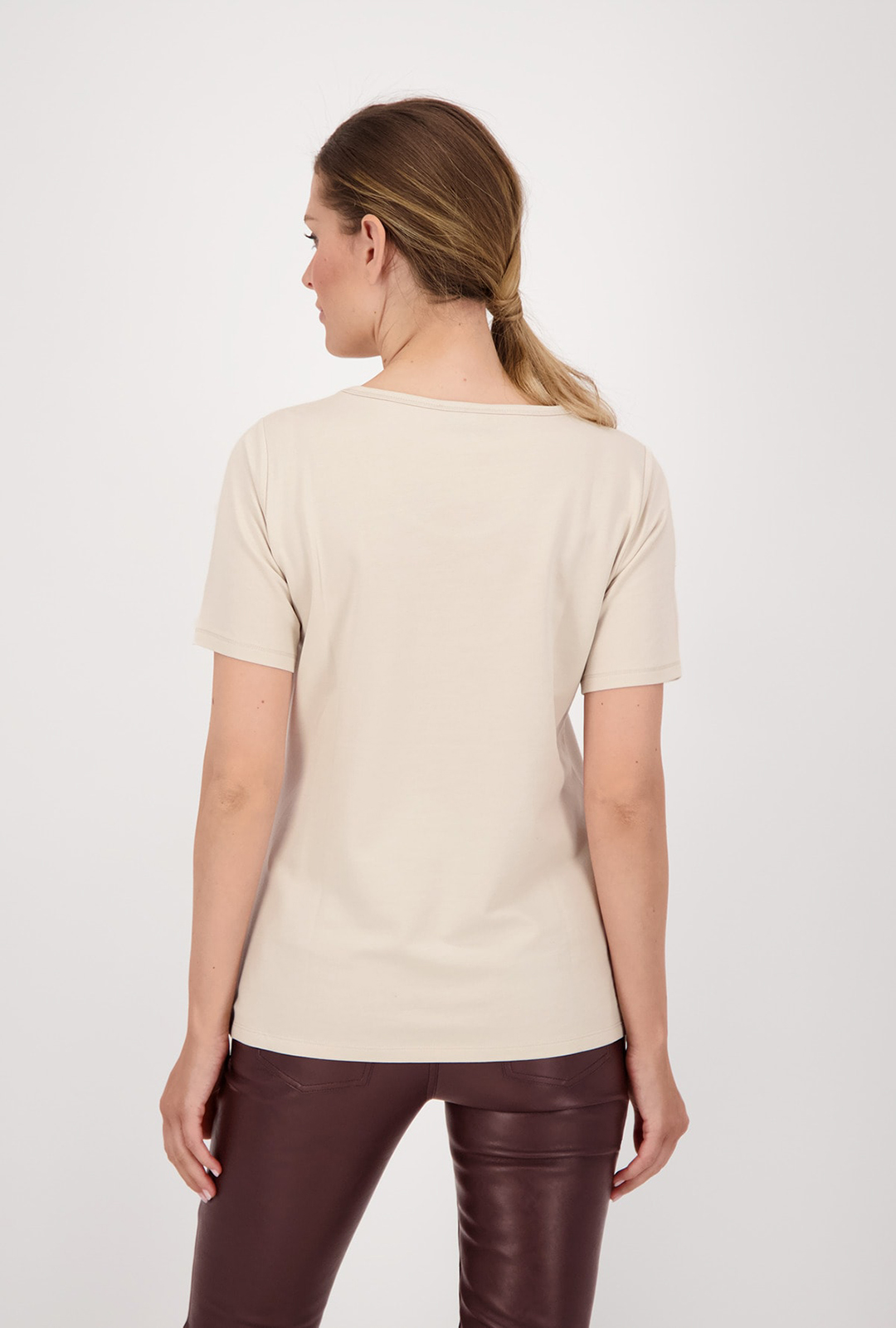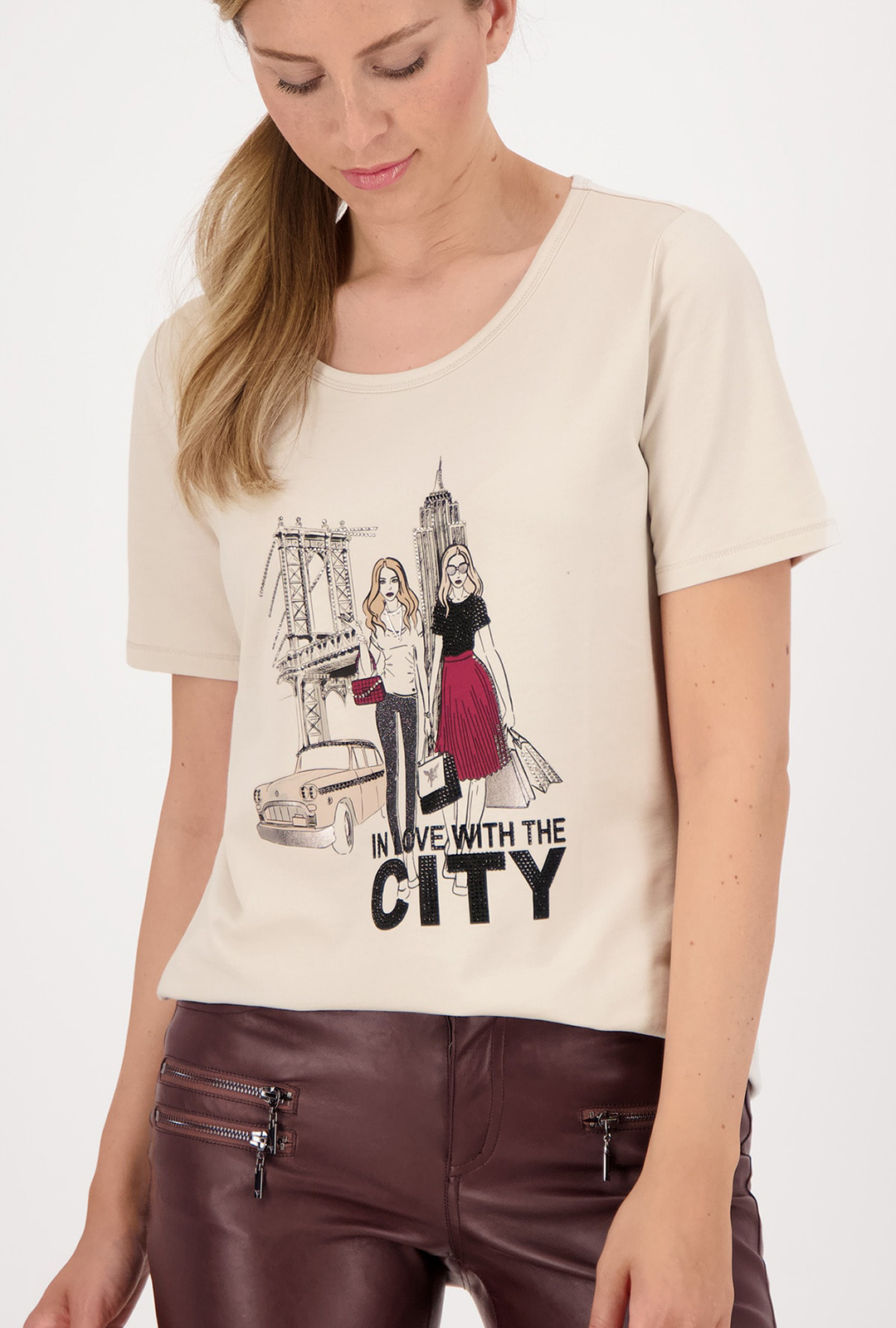 Однотонная бежевая футболка с принтом на груди. Прямой крой, широкий овальный вырез горловины, короткий втачной рукав. Футболка может выступать как самостоятельный верх или надеваться под жакет или кардиган.