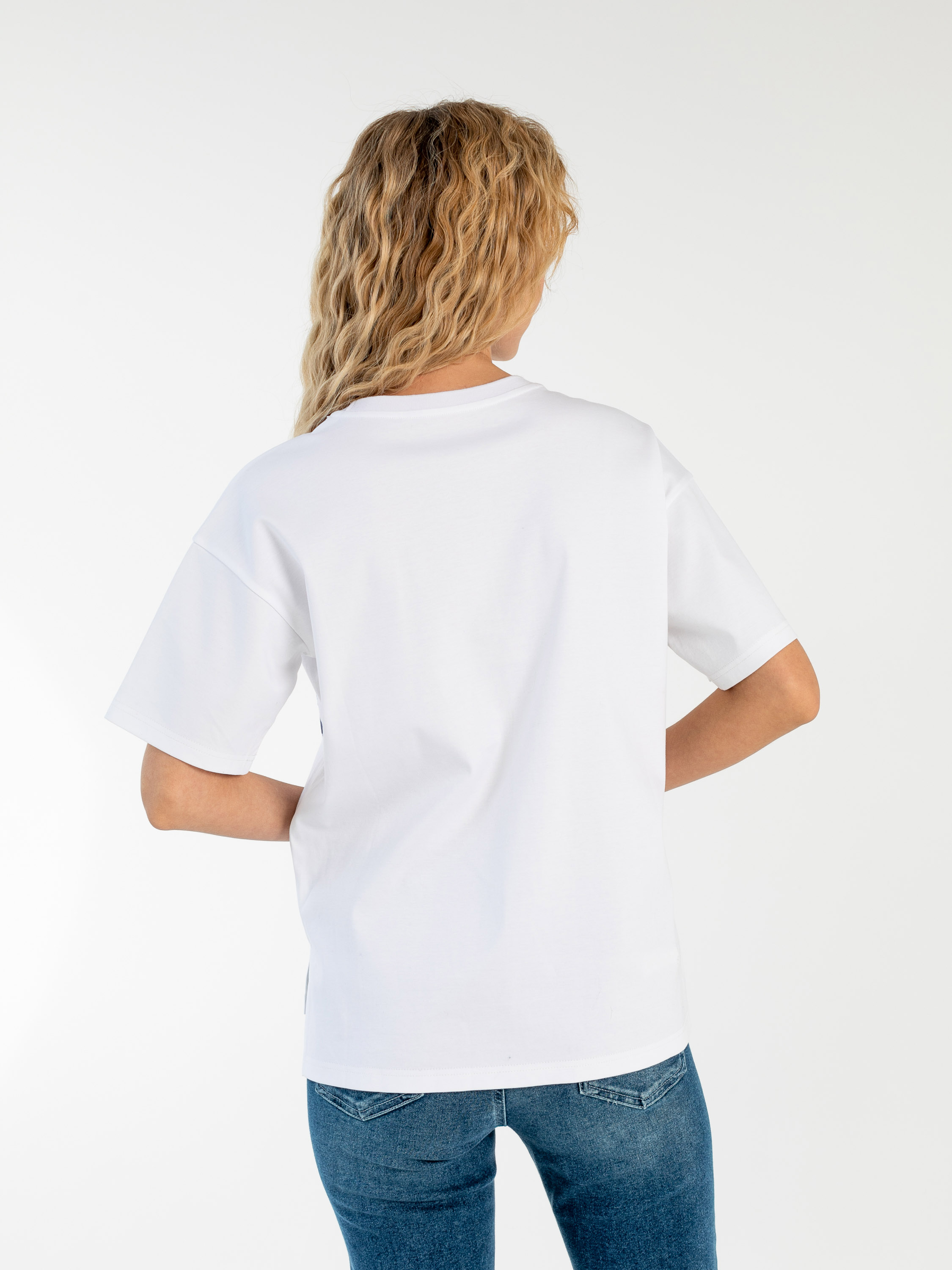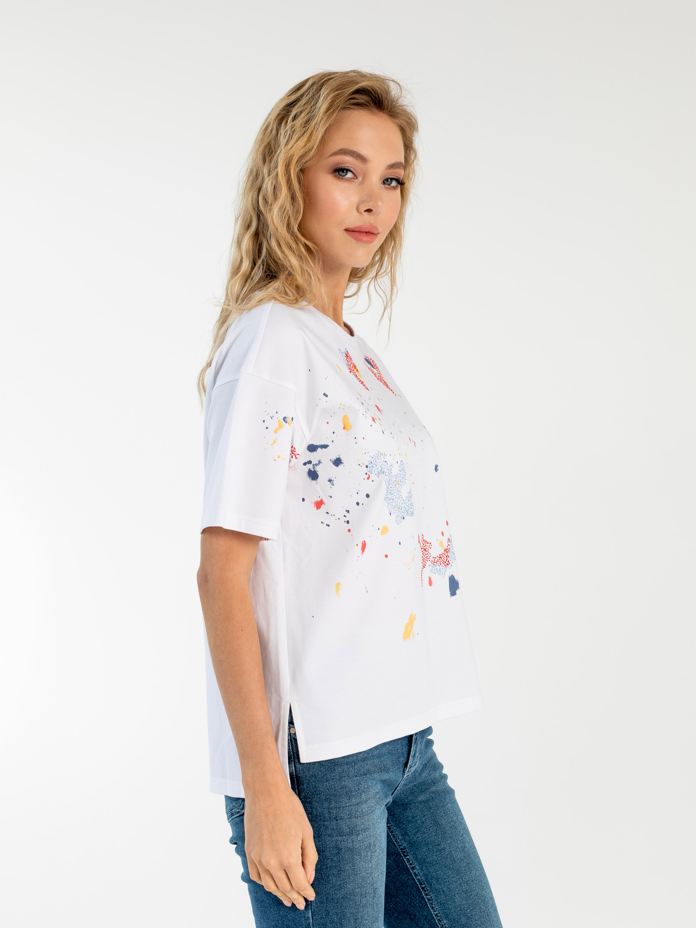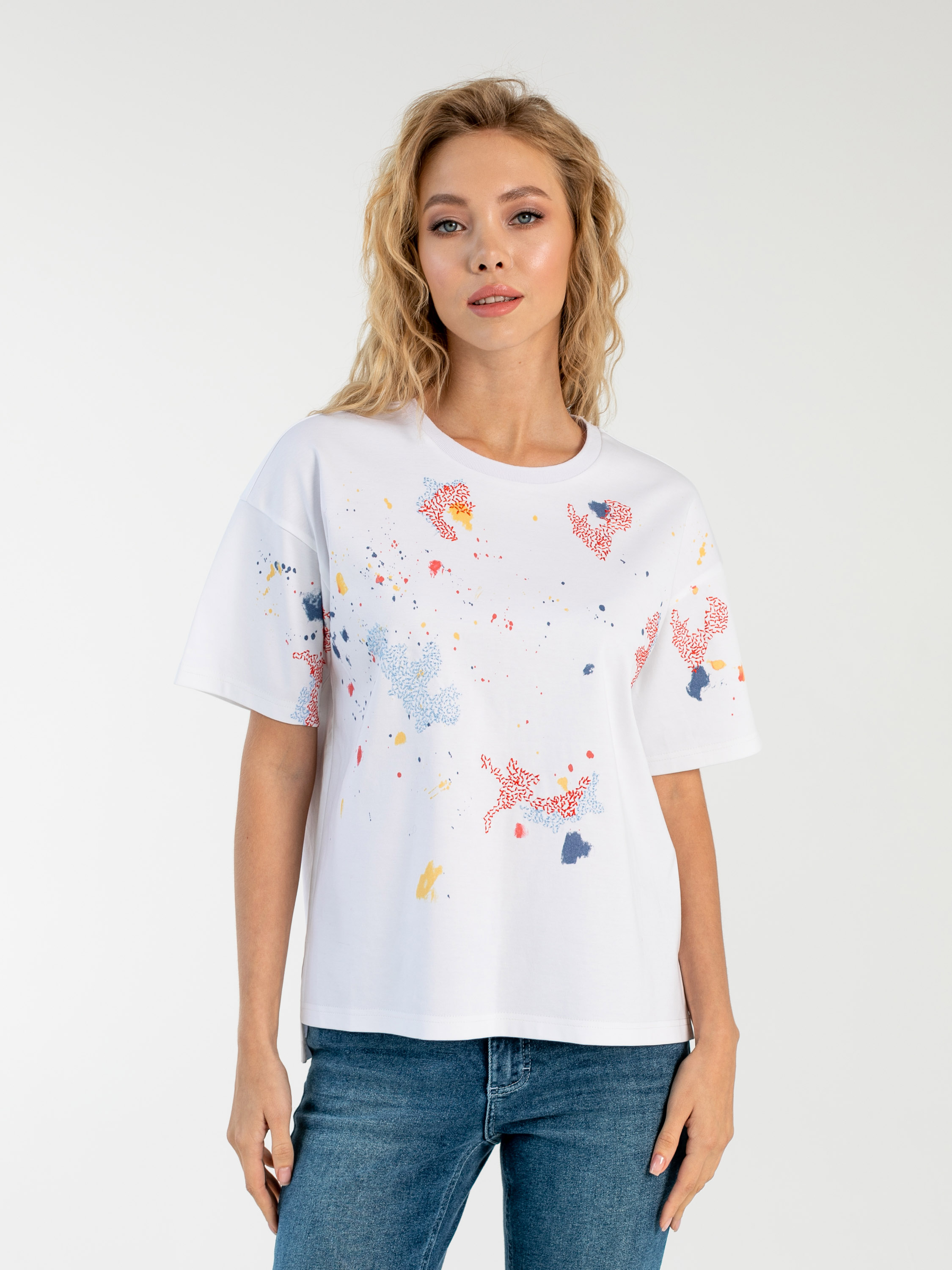 На сайте указаны российские размеры. Ткань: выполнена из 100% гладкого хлопка высокого качества. Крой: модель прямого силуэта с разным уровнем длины: спинка чуть длиннее переда. Имеет круглый вырез и втачной рукав-реглан. Разрезы по бокам добавляют комфорта при движении, а средняя длина располагает к активной деятельности – футболка не будет подниматься вверх. Отделка: абстрактный рисунок по корпусу и рукавам – символ того, что художник есть в каждом из нас. Только позвольте своему таланту развиться! Сочетается с брюками, джинсами, юбками и шортами из ассортимента Stern.