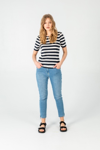 На сайте указаны российские размеры. Ткань: выполнена из гладкого хлопка высокого качества (95%) и эластана, добавляющего ткани упругости (5%) Крой: базовая футболка-тельняшка приталенного силуэта. Имеет круглый неглубокий вырез и короткий свободный зауженный рукав-реглан. Футболка средней длины, закрывает область живота, не поднимается вверх при движении. Отделка: горловина и низ футболки прострочены декоративным зигзагом. Сочетается с брюками, джинсами, юбками и шортами из ассортимента Stern.