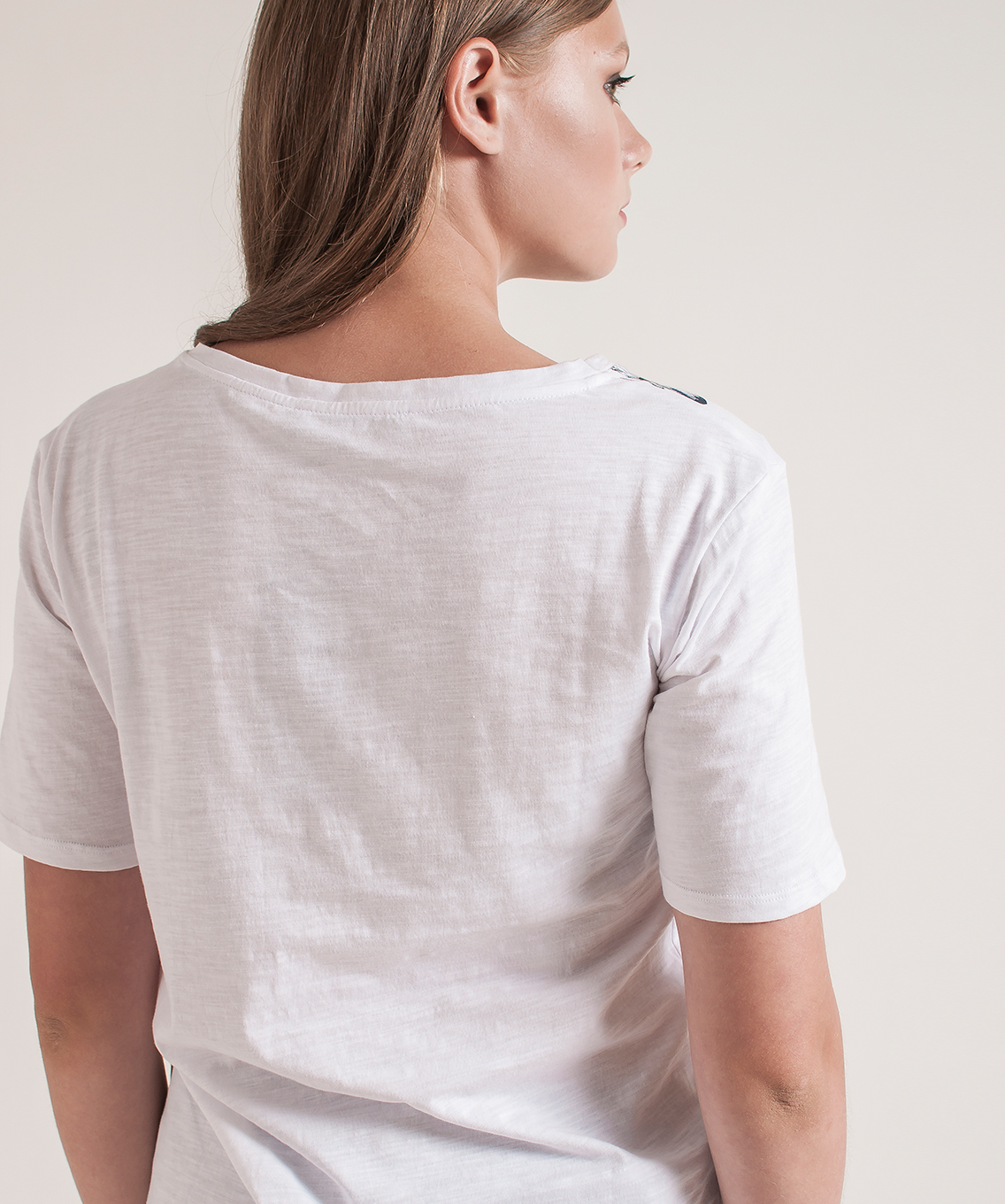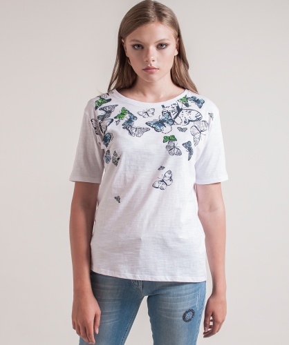 Футболка прямого покроя. Вырез горловины "лодочка". Принт с изображением бабочек подчеркивает нежный образ.