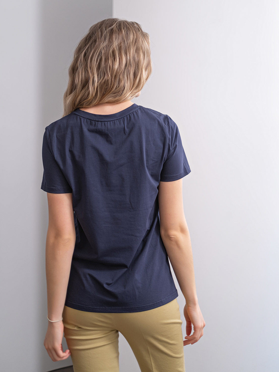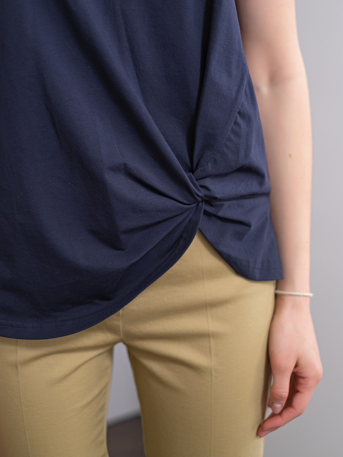 Ткань из натуральных материалов обеспечит комфорт и прохладу жарким летом. Круглый вырез горловины, декоративный элемент в виде фигурного узла и закругленный низ футболки создадут женственный образ. Данная модель будет хорошо сочетаться с брюками и с юбкой-карандашом.