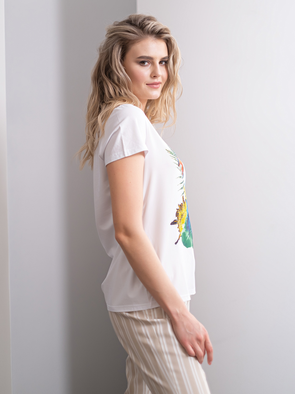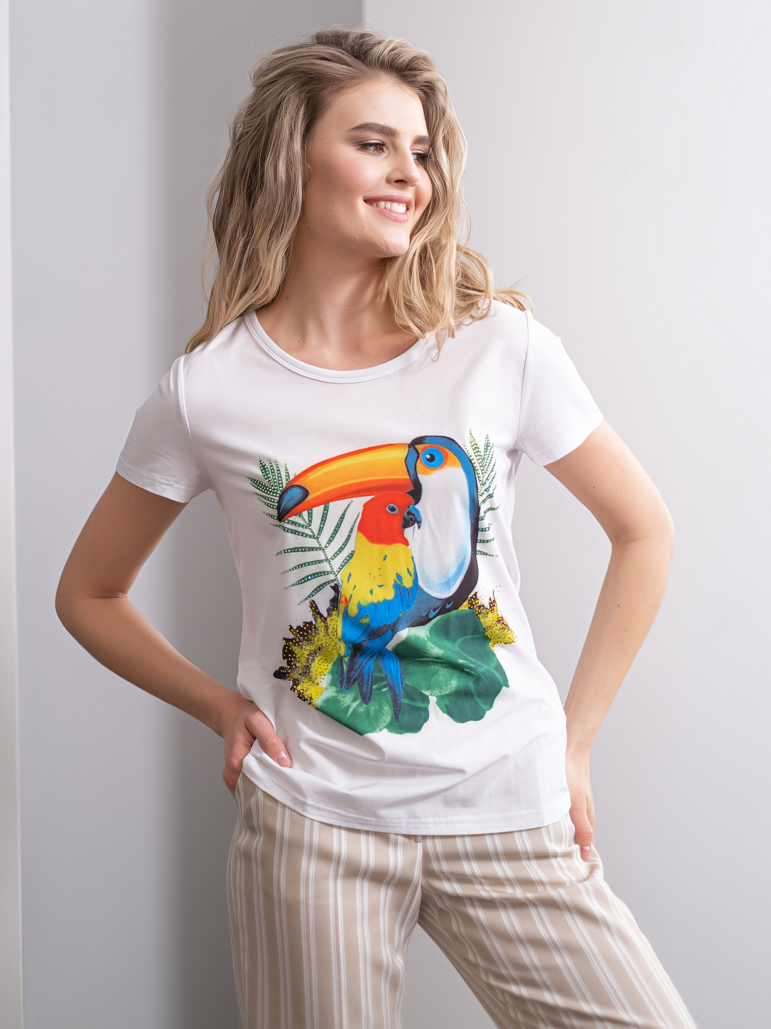 Футболка из приятной на ощупь ткани. Натуральные материалы в составе изделия обеспечат комфорт и прохладу жарким летом. Круглый вырез горловины создаст женственный образ. Посадка по фигуре. Модный в новом сезоне принт с тропическими птицами подчеркнет чувство вкуса обладательницы футболки. Данная модель будет прекрасно сочетаться как с брюками, так и с юбкой.