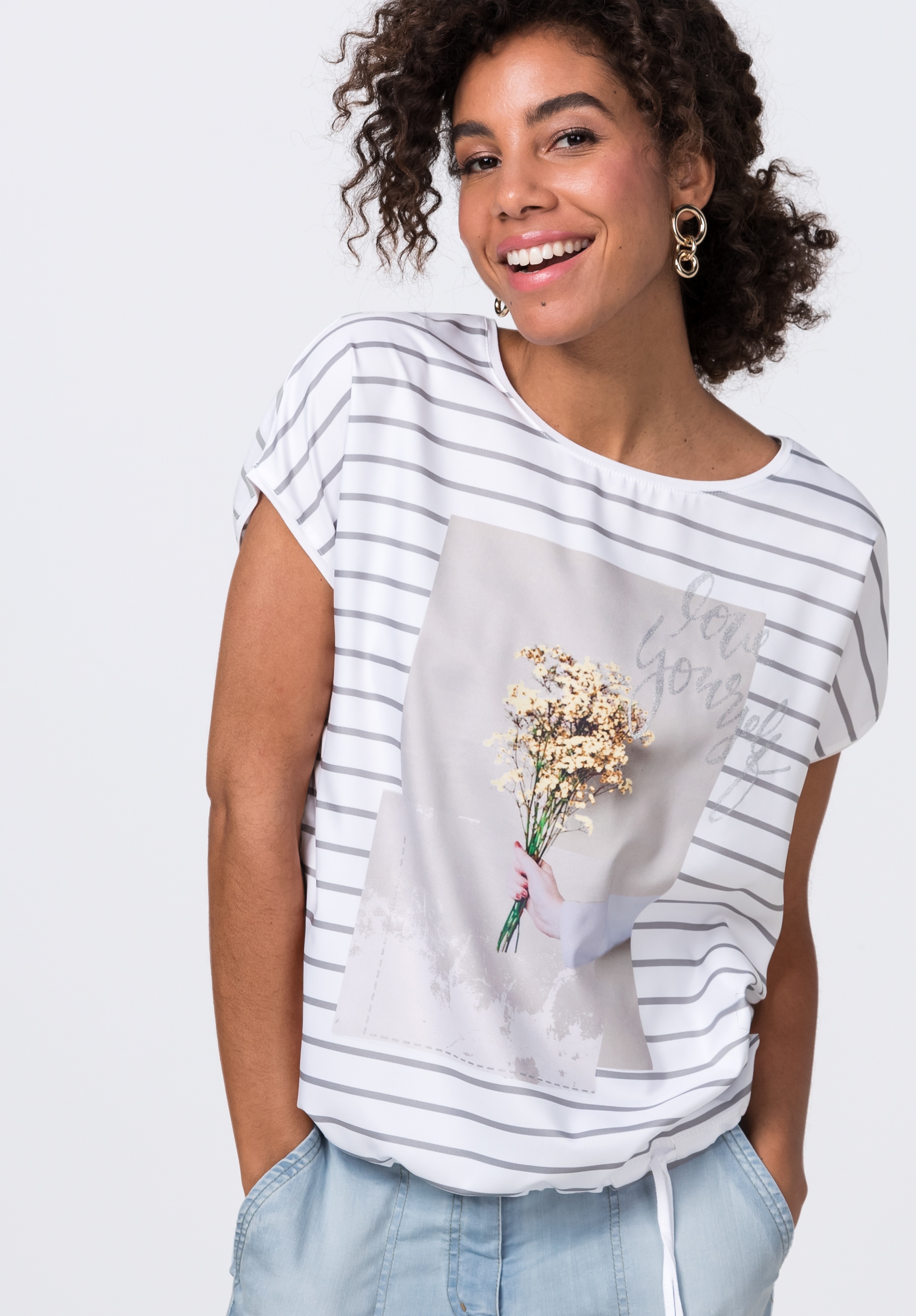 Футболка с принтом, круглым вырезом и объемными рукавами. Атласная отделка спереди, трикотаж сзади. Кулиска с завязками на кромке.
