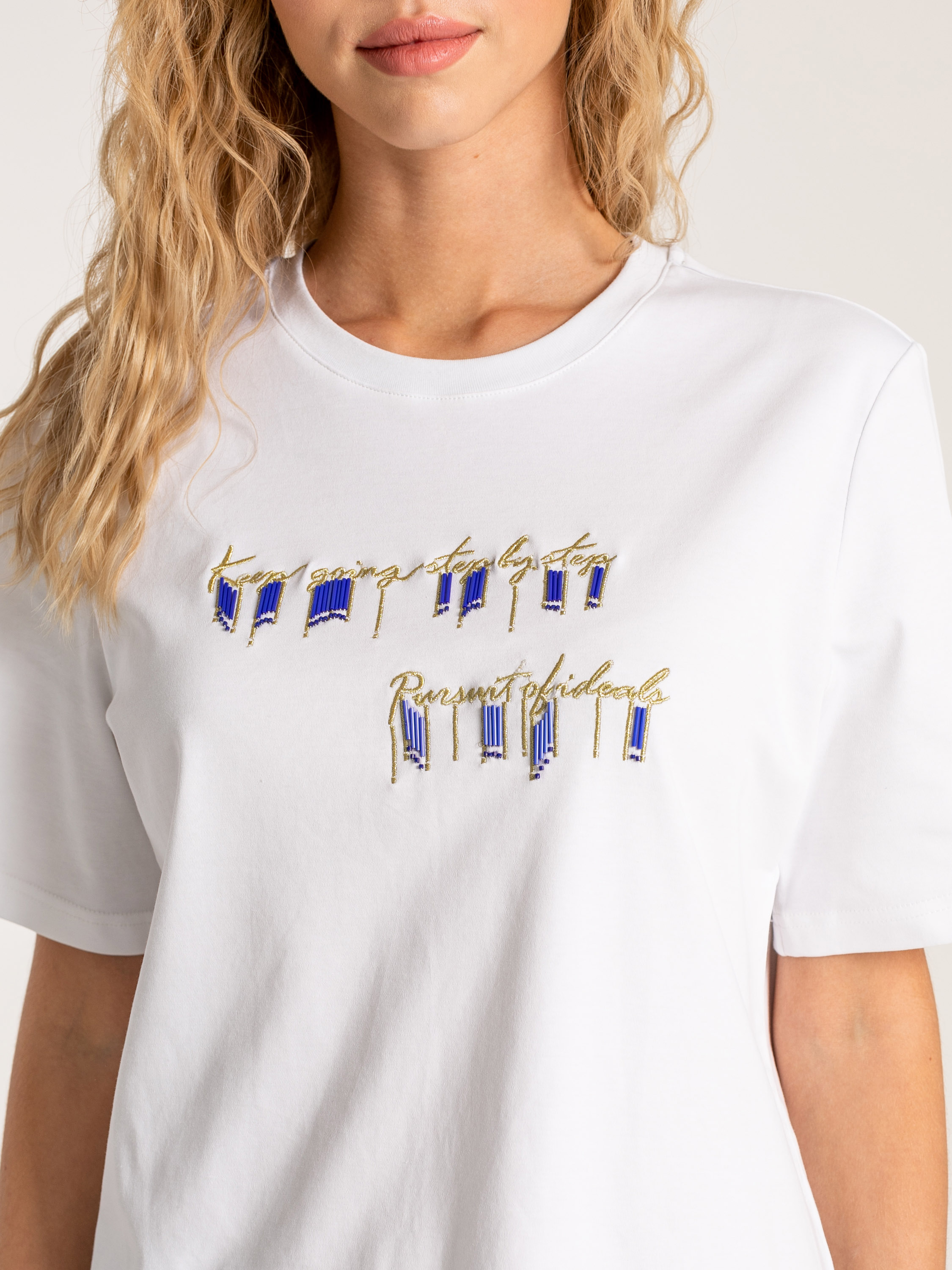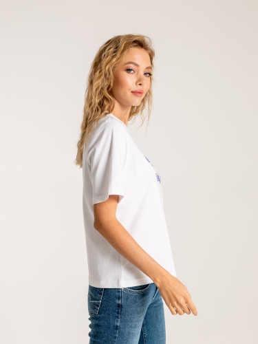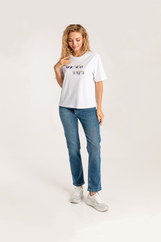 Футболка средней длины прямого силуэта из легкого 100% хлопка. По переду выполнена потрясающая вышивка. Укороченные втачные рукава. Круглый вырез горловины.