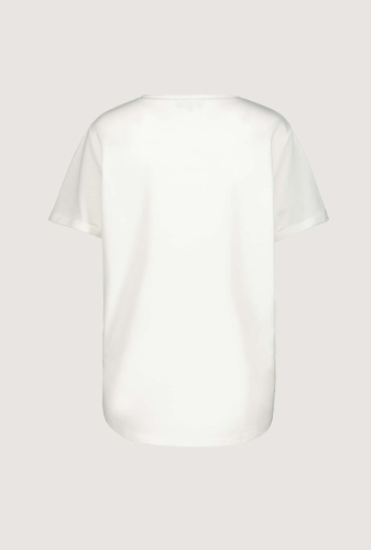На сайте указаны Российские размеры. Футболка с короткими рукавами и круглым вырезом. На передней части футболки изображен крупный стильный текст. Прямой крой с подвернутыми концами рукавов, круглый вырез горловины с подвернутым краем и блестящим оверлочным швом с люрексом, а также удлиненная спина с закругленным низом. Параметры модели: 42 размер, рост 174 см
