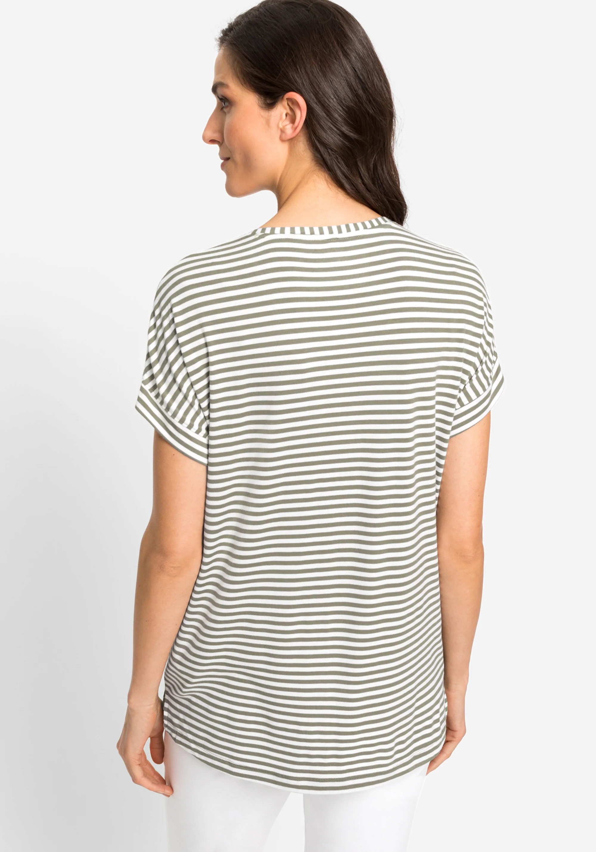 На сайте указаны российские размеры. Эта футболка - красивое сочетание сплошного цветочного принта спереди и классического полосатого узора сзади. Слегка закругленный V-образный вырез и манжеты, красиво подчеркнутые полосками. Рубашка немного длиннее сзади, чем спереди, создает красивую струящуюся драпировку и имеет облегающий крой. Бонус: он изготовлен из экологически чистого вискозного волокна ECOVERO™, созданного из древесины местного, контролируемого и органического выращивания.