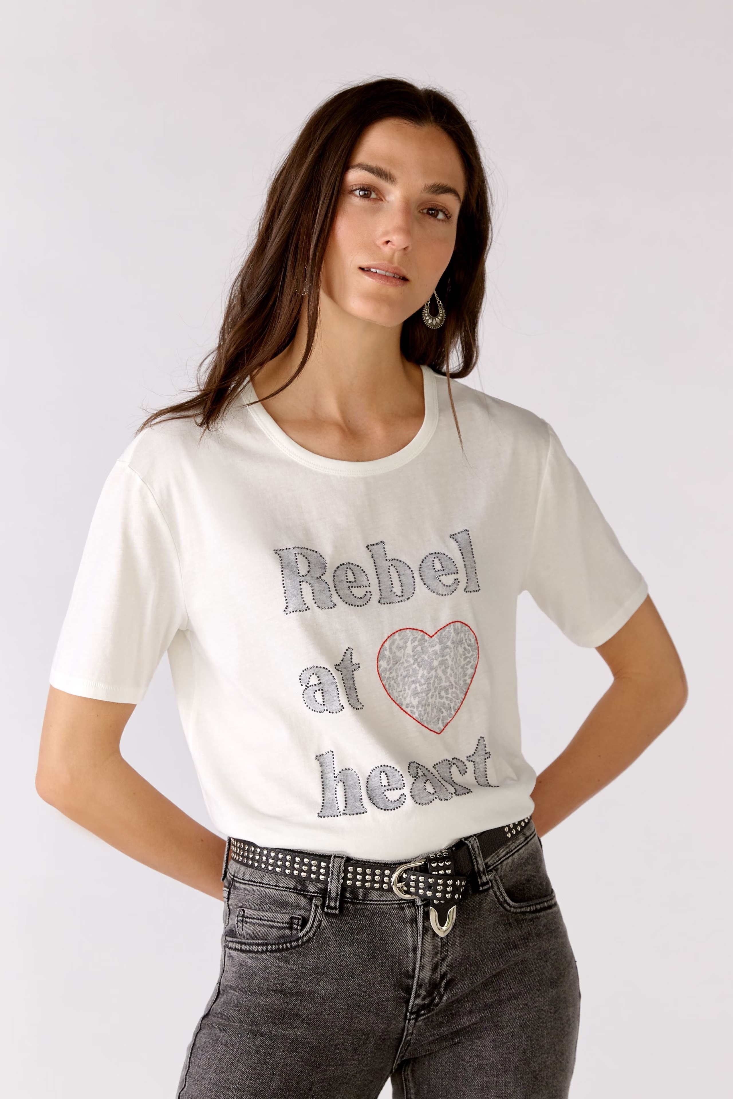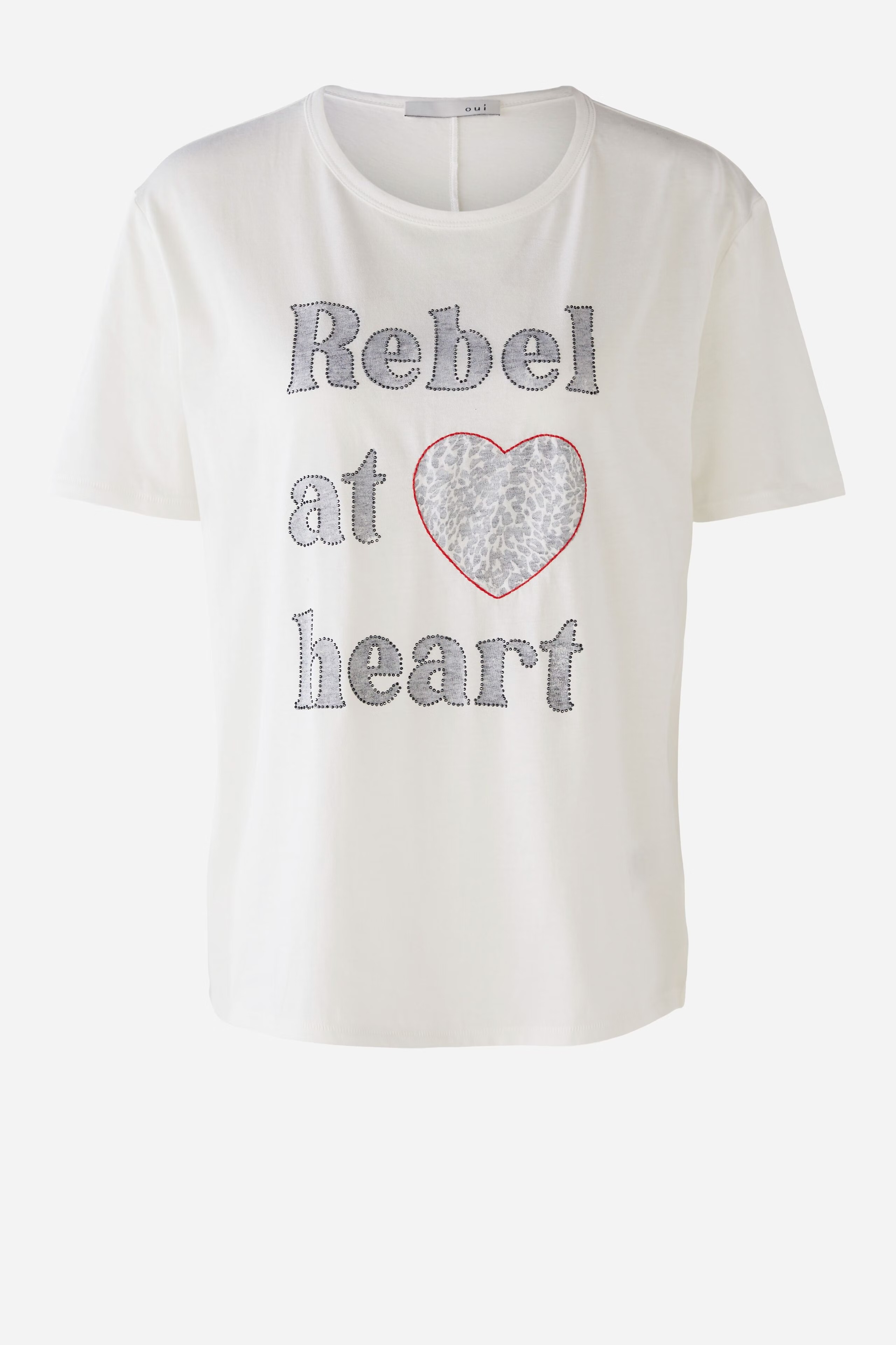 На сайте указаны российские размеры. Повседневный крой с чуть более длинными короткими рукавами. Оригинальный принт наизнанку с декоративными камнями. Контрастная цветная вышивка в форме сердца. Круглый вырез спортивного кроя. Рост модели 178 см