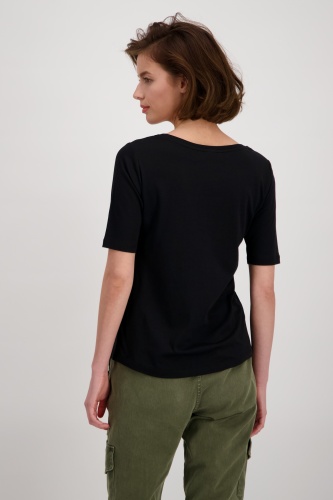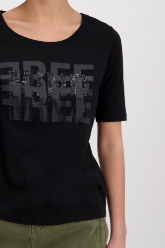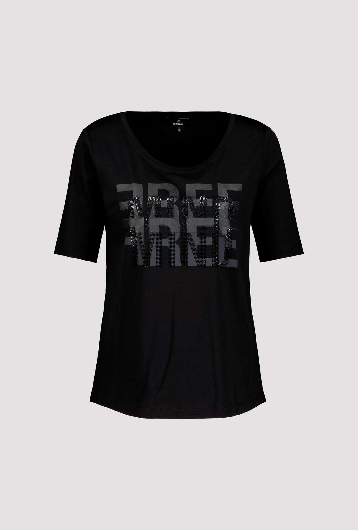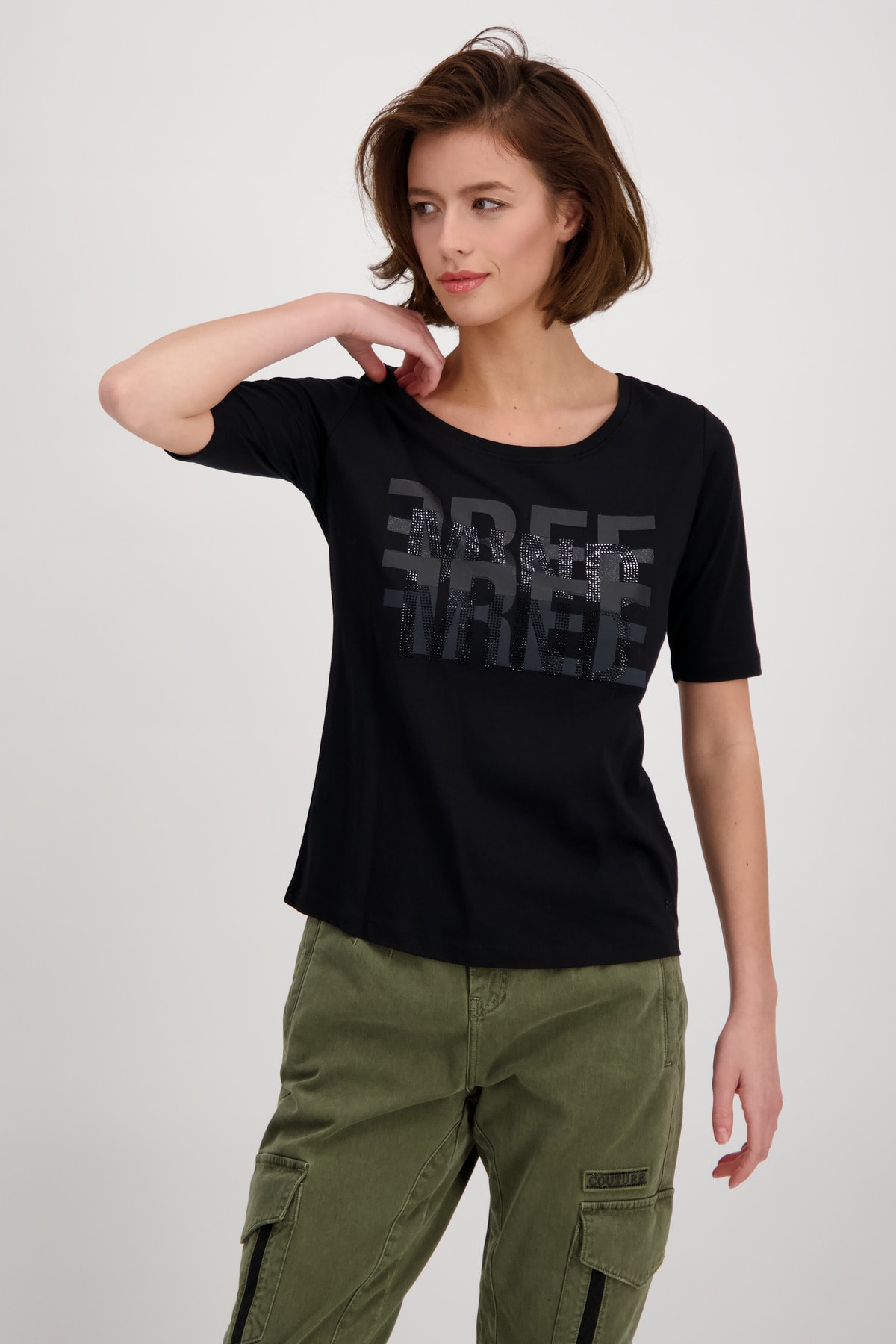 На сайте указаны российские размеры. Легкая футболка из джерси с короткими рукавами и стразами. Прямой крой с небольшой вставкой на круглой горловине и закругленным низом. Детали: перед с гламурным шрифтом из блестящего лакового принта и сверкающих страз. Качество: изготовлено из высококачественного хлопка с примесью модала. Идеально подходит для бесчисленных образов. Сочетайте рубашку с приятным комфортом при ношении по своему желанию! Модель ростом 178 см. Длина спины 44 размера 64 см.
