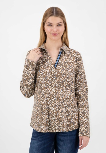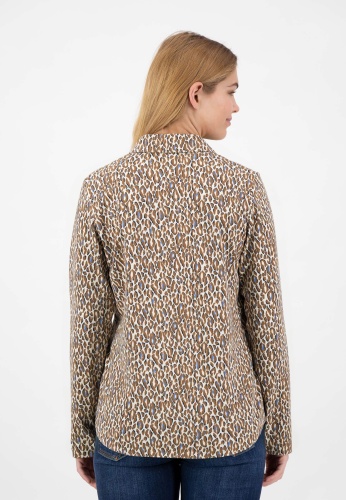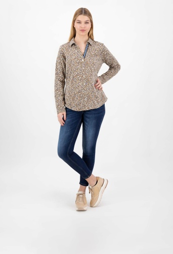 На сайте указаны российские размеры. Эластичная футболка с длинными рукавами в женственном спортивном стиле. Высококачественная эластичная смесь материалов обеспечивает приятный и высокий комфорт при ношении. Классические элементы блуз с рубашечным воротником, такие как воротник рубашки и планка с имитацией пуговиц, придают рубашке модный характер. V-образный вырез, прикрепленный к воротнику рубашки, и анималистический принт по всей поверхности делают дизайн более свободным и придают рубашке спортивный вид. Еще одним привлекательным элементом является вышитая декоративная полоса на подкладке V-образного выреза. Наша модель ростом 177 см. Измерения для размера 44: Окружность груди: 100 см Талия: 95 см Бедра: 106 см Длина спинки: 65 см. Длина рукава: 62 см.