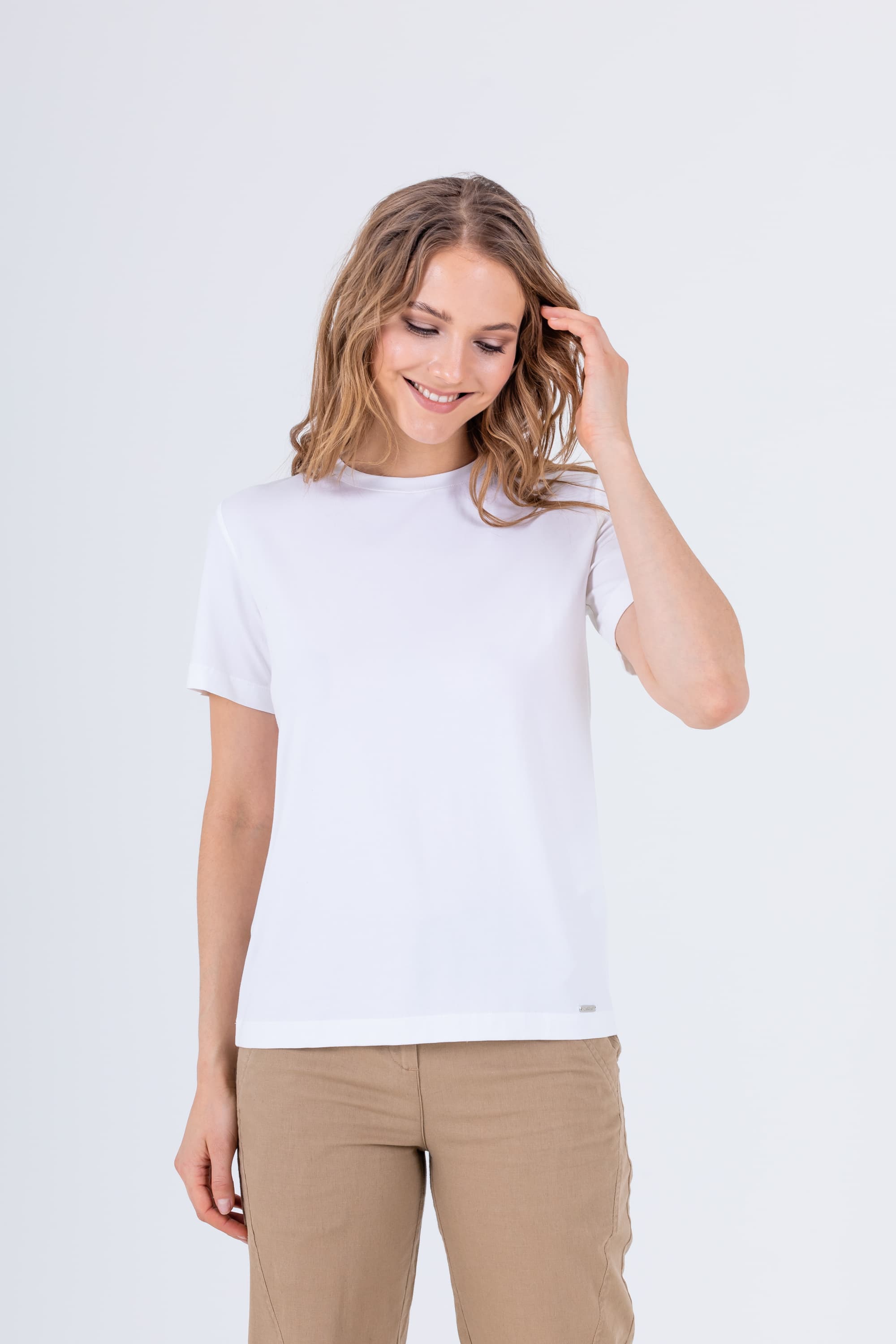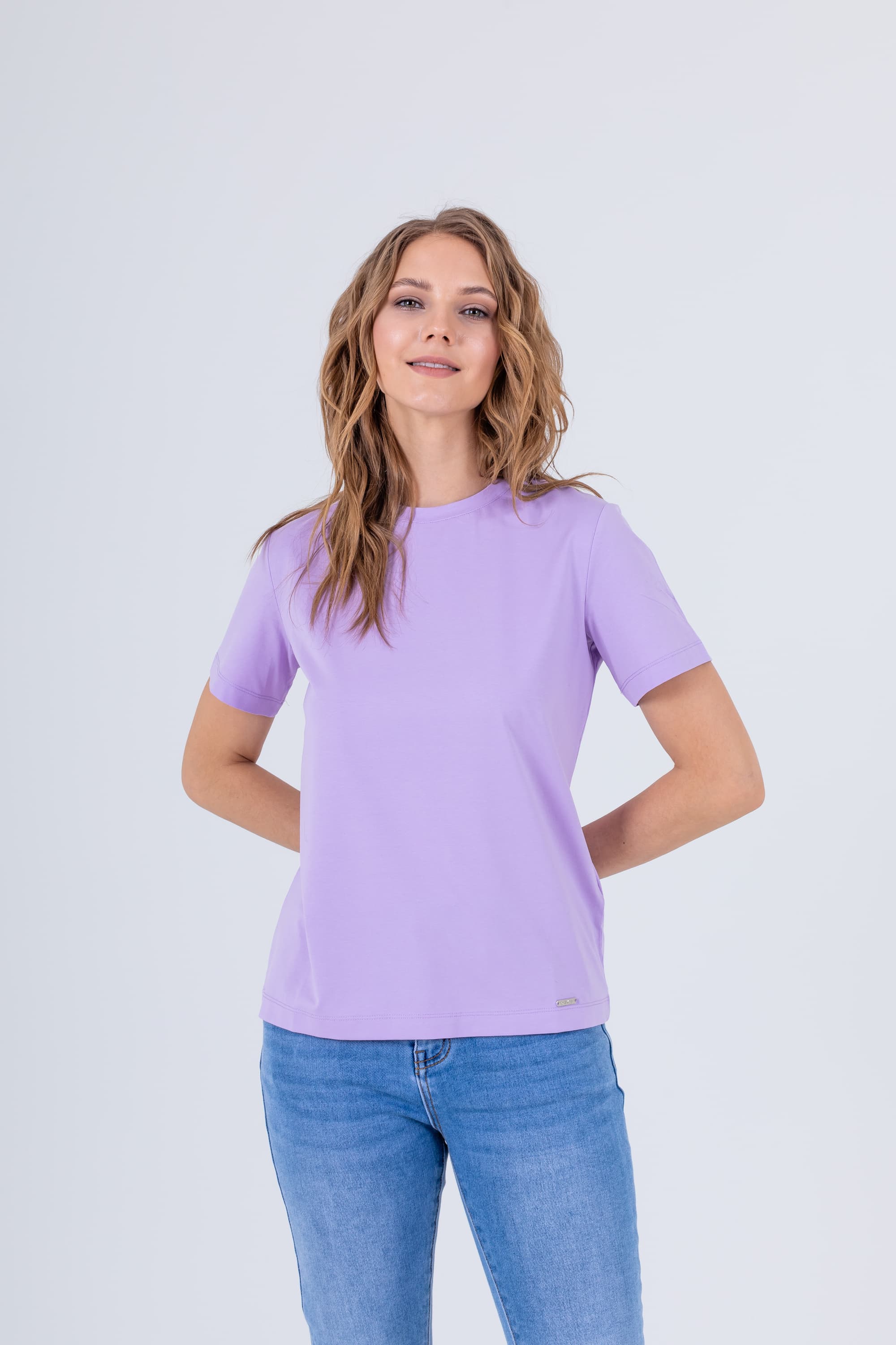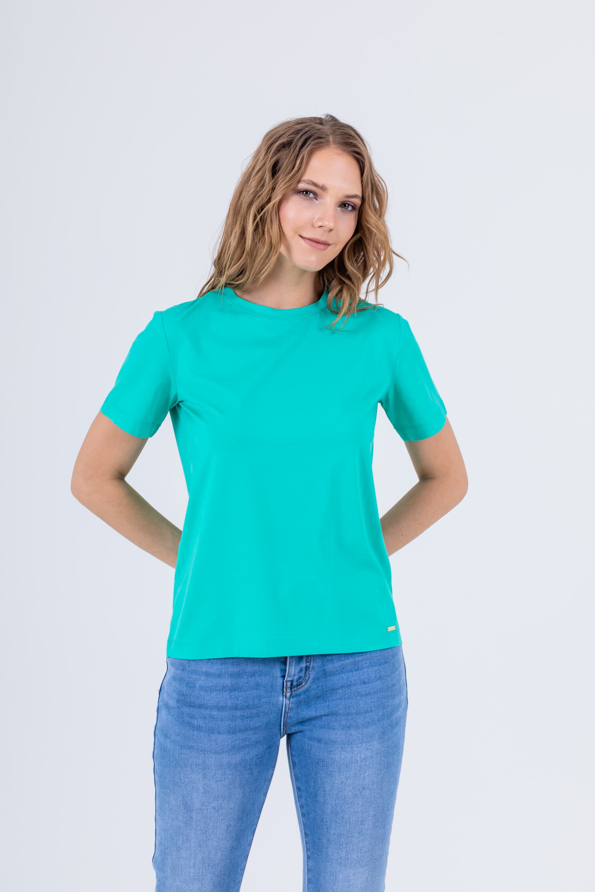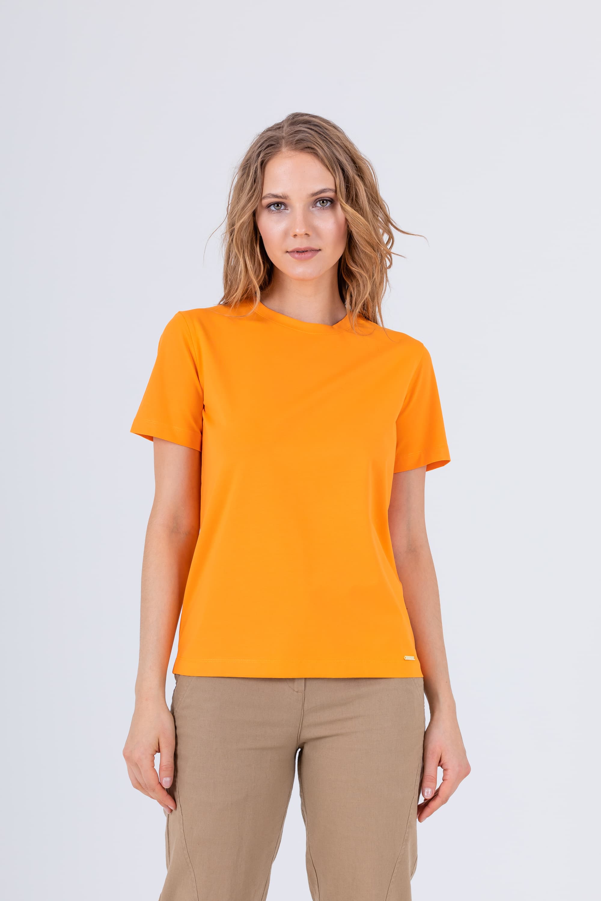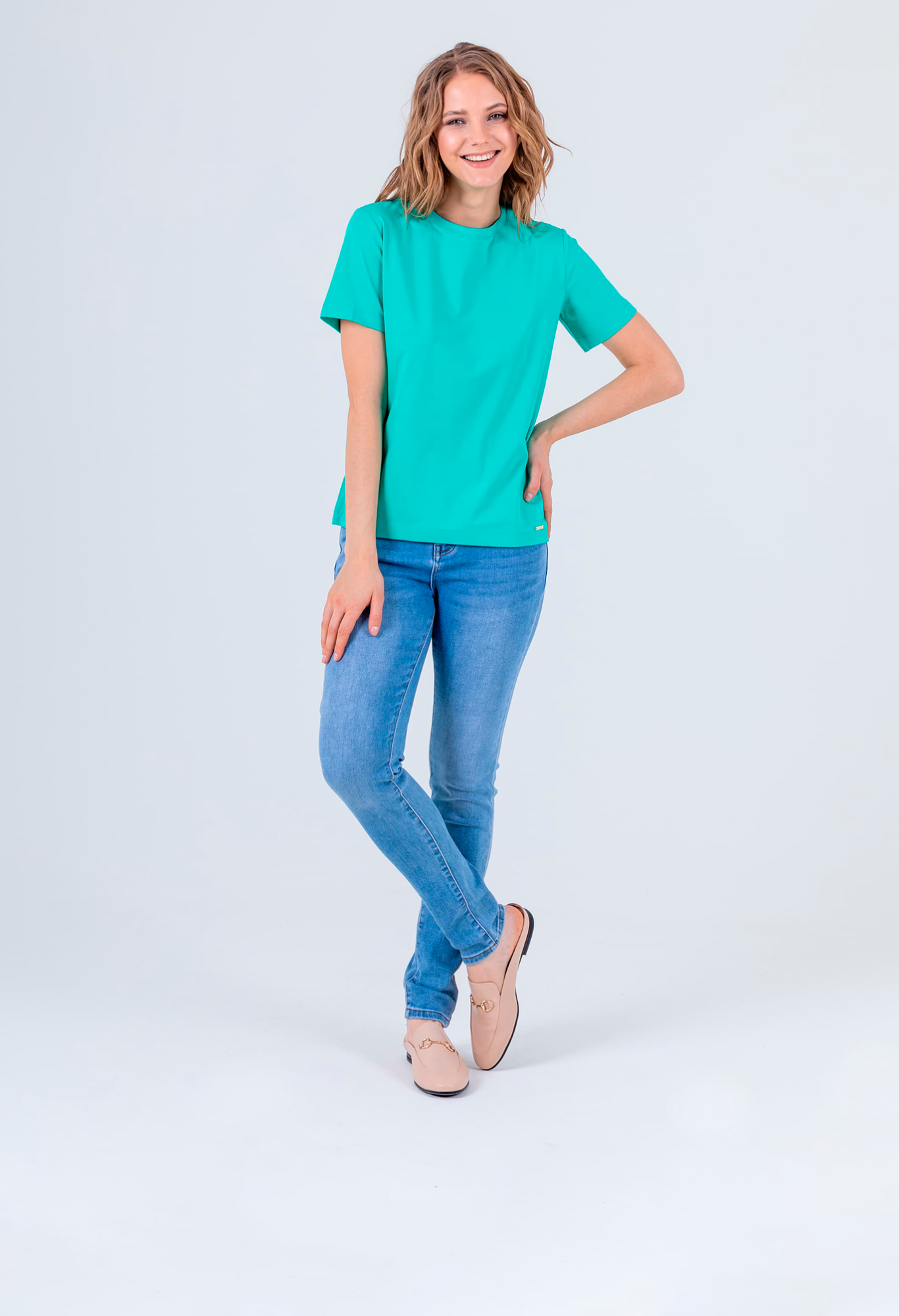 Яркая футболка средней длины прямого силуэта из легкого хлопка, мягкой вискозы и с добавлением эластана. Укороченные втачные рукава. Круглый вырез горловины.