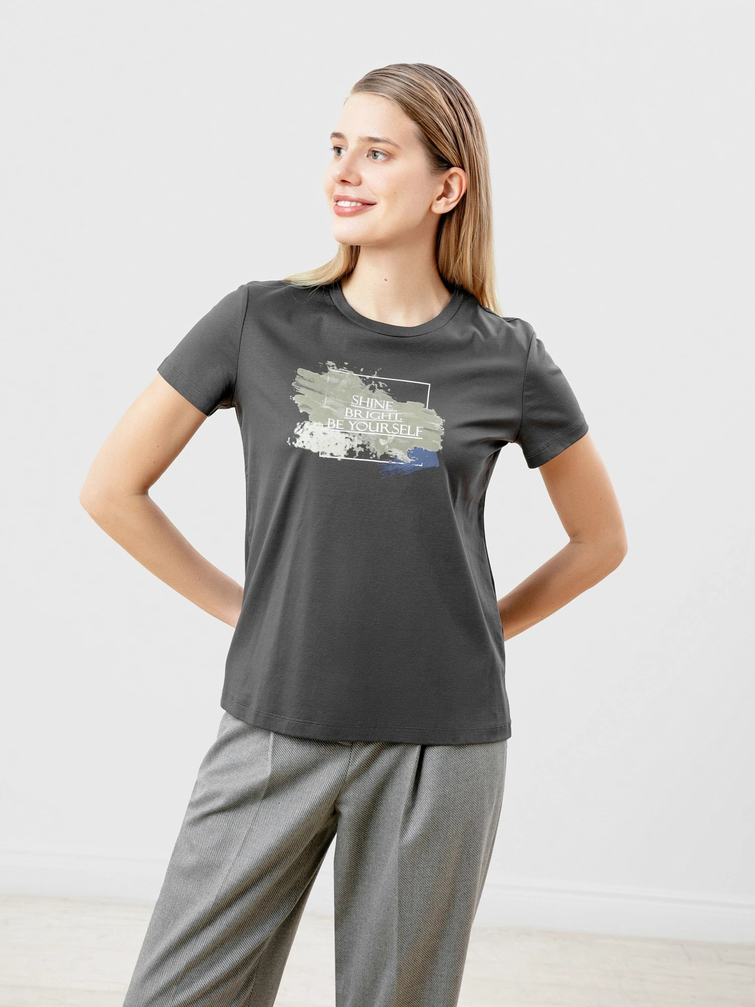 На сайте указаны российские размеры. Футболка полуприлегающего силуэта из трикотажного полотна темно-серого цвета с ярким контрастным абстрактным принтом. Вырез горловины круглый, рукав короткий втачной. Эта модель станет прекрасным нижним слоем под жакеты. Рост модели на фото - 175 см.