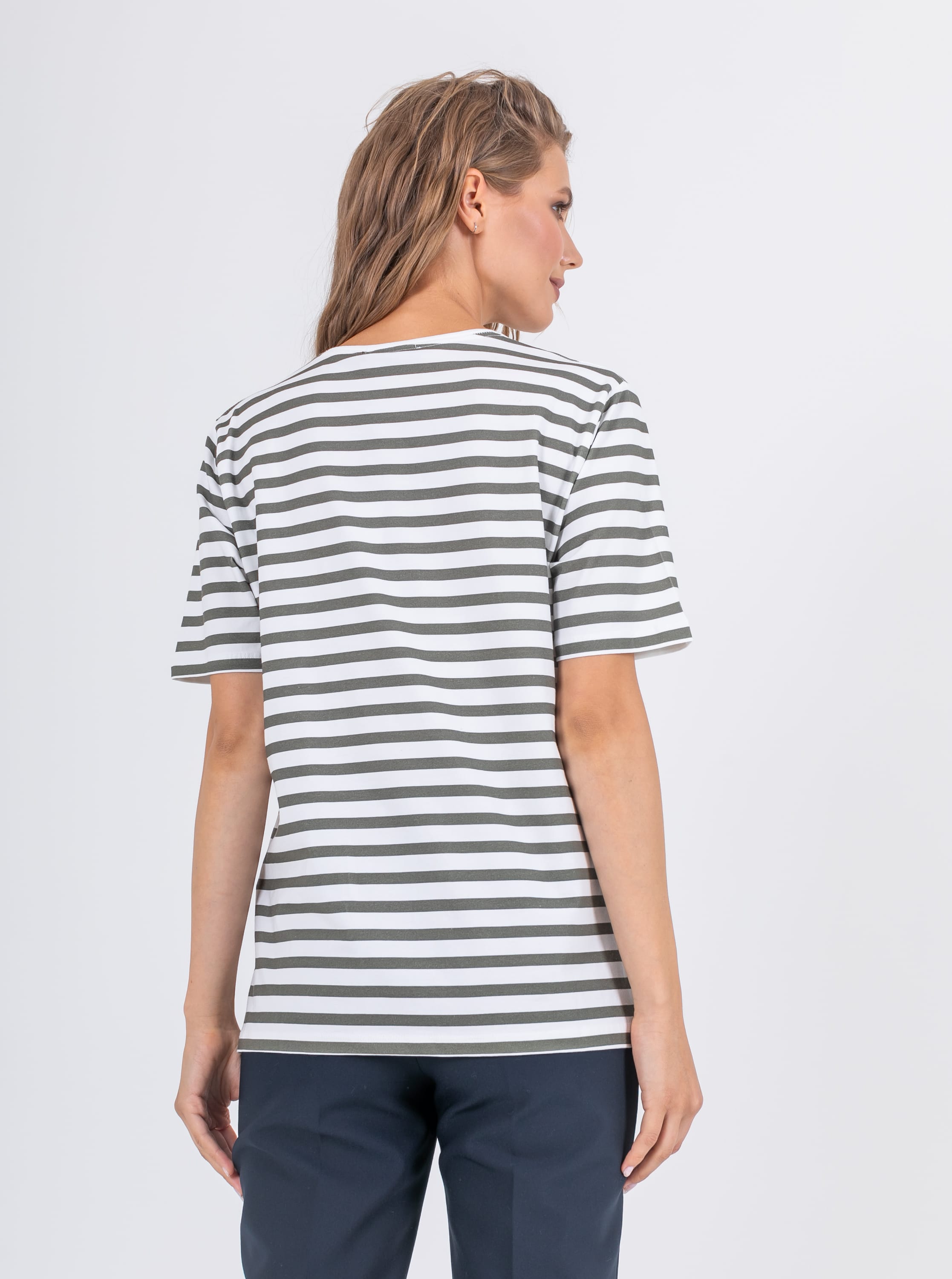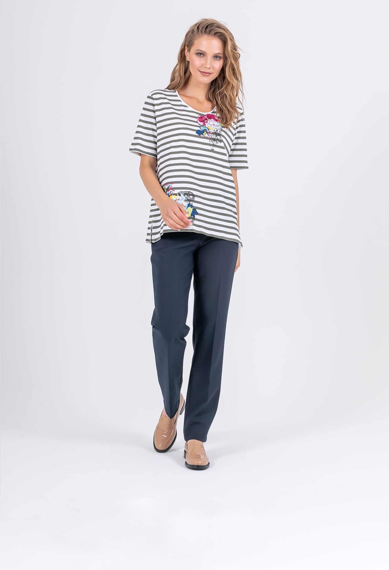 На сайте указаны российские размеры. Ткань: выполнена из гладкого хлопка высокого качества (95%) и эластана, добавляющего ткани упругости (5%) Крой: футболка в полоску свободного силуэта. Имеет круглый вырез и втачной рукав-реглан. Футболка выполнена из гладкого, приятного телу хлопка, который дарит максимальный комфорт – не натирает и не раздражает кожу. Средняя длина, закрывает зону живота, не поднимается вверх при движении. Отделка: нанесенные по диагонали принты, украшенные переливающимися пайетками. Подобрать брюки, шорты или джинсы можно в соответствующих разделах на сайте.
