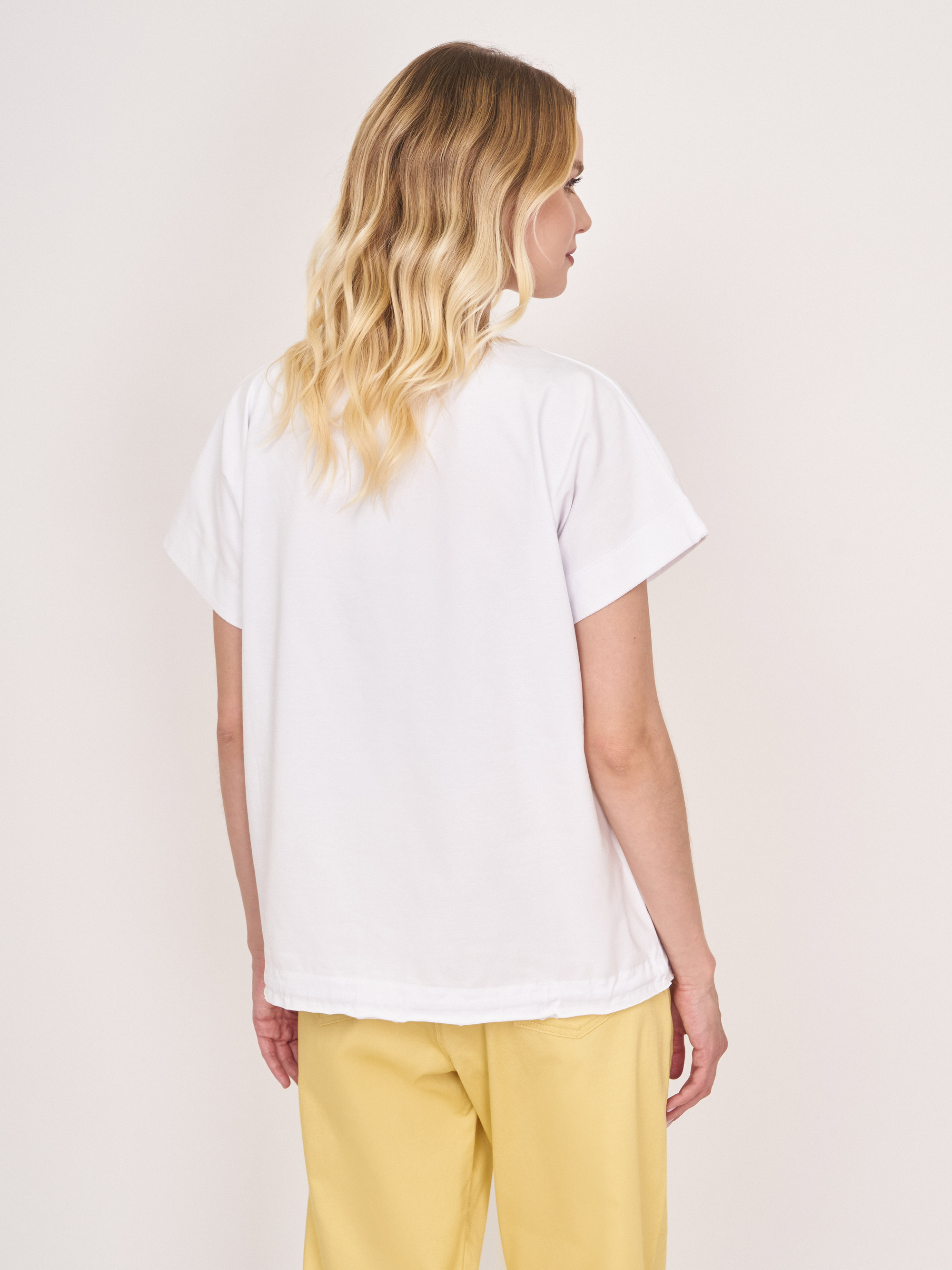 На сайте указаны российские размеры. Белый прямой хлопковый джемпер-футболка с круглым вырезом, с коротким рукавом, с бежевой вышитой надписью, с кулиской понизу изделия. Длина по спинке: 60 см. Рост модели: 176 см.