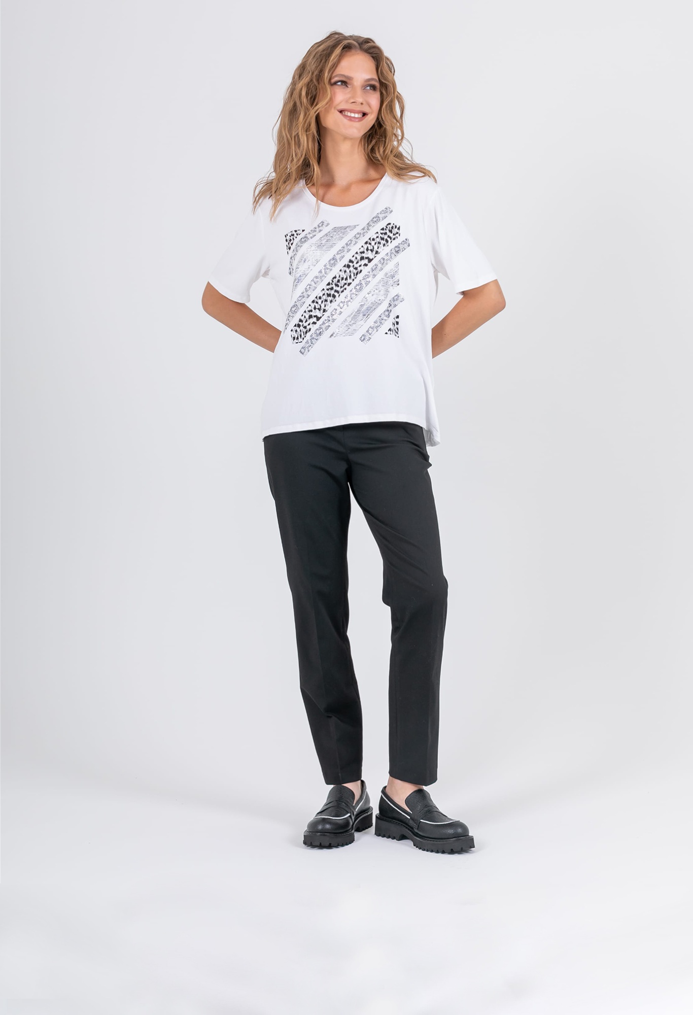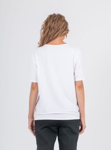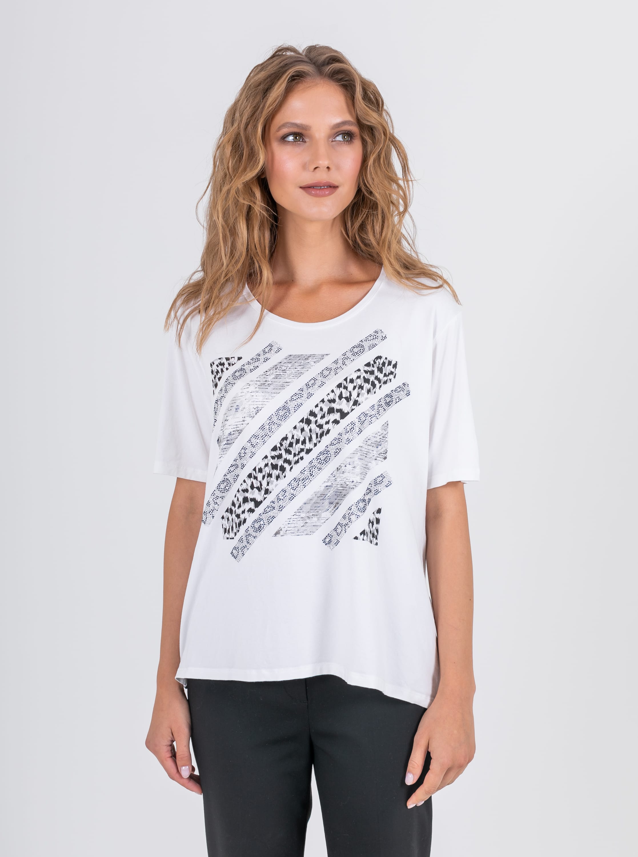 На сайте указаны российские размеры. Ткань: изготовлена из высококачественной вискозы (92%) – экологичного материала, хорошо пропускающего воздух и впитывающего излишки влаги, и эластана (8%), придающего ткани упругость. Крой: футболка средней длины свободного силуэта. Имеет круглый вырез и свободные рукава-регланы, которые дарят максимум свободы и комфорта. Белый цвет футболки освежает, делает образ легким и современным. Отделка: украшена принтом с животными мотивами. Часть композиции составляют усыпанные стразами элементы, добавляющие изделию торжественности и блеска.