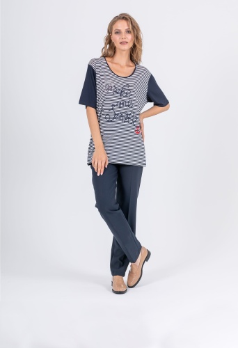 На сайте указаны российские размеры. Ткань: изготовлена из высококачественной вискозы (92%) – экологичного материала, хорошо пропускающего воздух и впитывающего излишки влаги, и эластана (8%), придающего ткани упругость. Крой: удлиненная футболка прямого силуэта с круглой горловиной и свободным рукавом-регланом. Дарит комфорт и свободу движения, без скованности. Полностью не прилегает к телу, а значит, не подчеркивает возможные нюансы фигуры, о которых не нужно знать всем. Отделка: спинка и рукава – однотонные, передняя часть футболки – из полосатой ткани, на которой вышит текст и яркий красный якорь, напоминающие об отдыхе на море. Футболка также украшена элементом из страз, которым не страшны многочисленные циклы стирок.