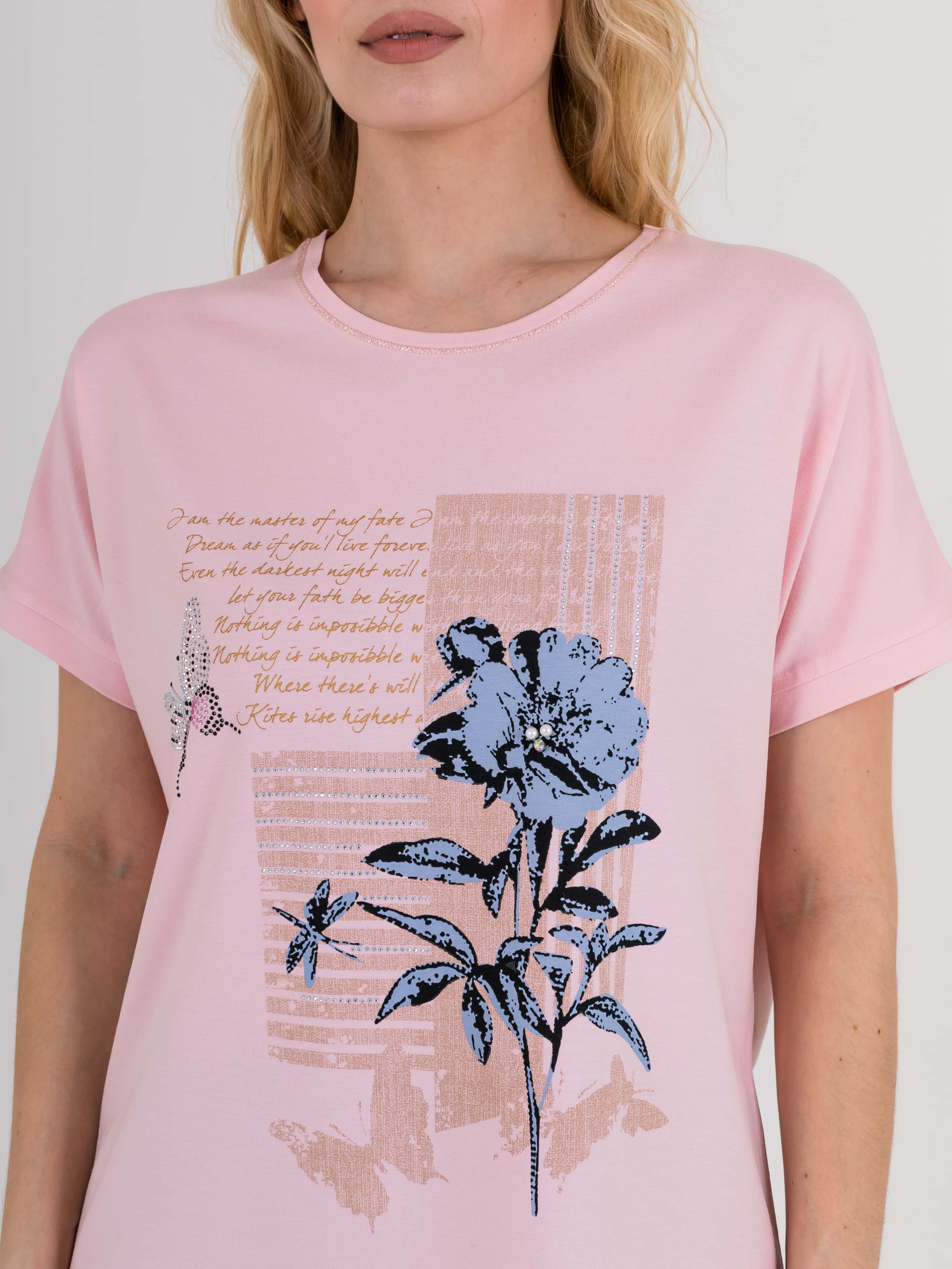 На сайте указаны российские размеры. Футболка средней длины прямого силуэта из легкой, мягкой вискозы с добавлением эластана. По переду выполнен цветочный принт, дополненный стразами. На спинке выполнена аппликация из страз. Короткие цельнокроеные рукава. Круглый вырез горловины, обработан отделочной строчкой.