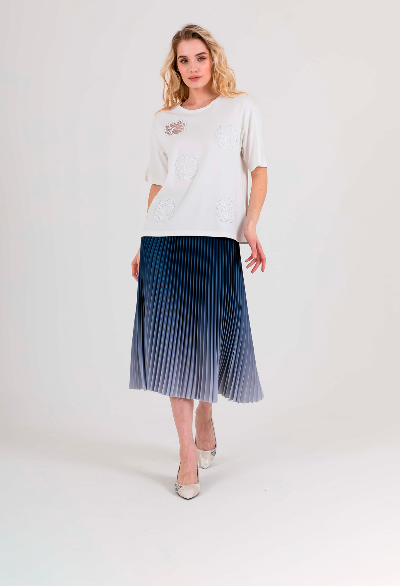 Длинная оверсайз футболка прямого силуэта из легкой, мягкой вискозы с добавлением эластана. По переду выполнена нежная вышивка на сетке, украшенная стразами. Укороченные втачные рукава со спущенной линией плеча. Круглый вырез горловины.