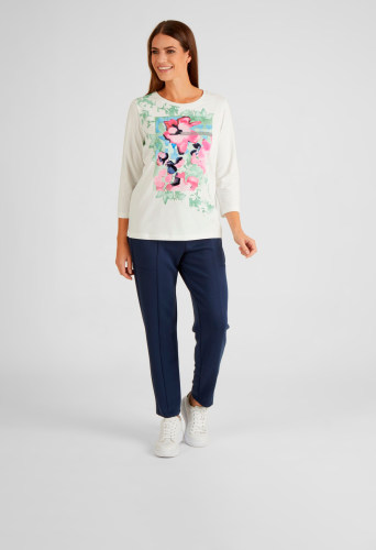 На сайте указаны российские размеры. Однотонная рубашка с рукавами 3/4 и очаровательным принтом спереди и аппликацией из страз привлекает внимание. Качество мягкого трикотажа и хлопка гарантирует удобную посадку. Сочетайте эту рубашку с джинсами или небрежно с спортивными брюками. Рост модели 176 см. Длина по спинке от плеча для размера 46: 64 см.