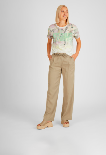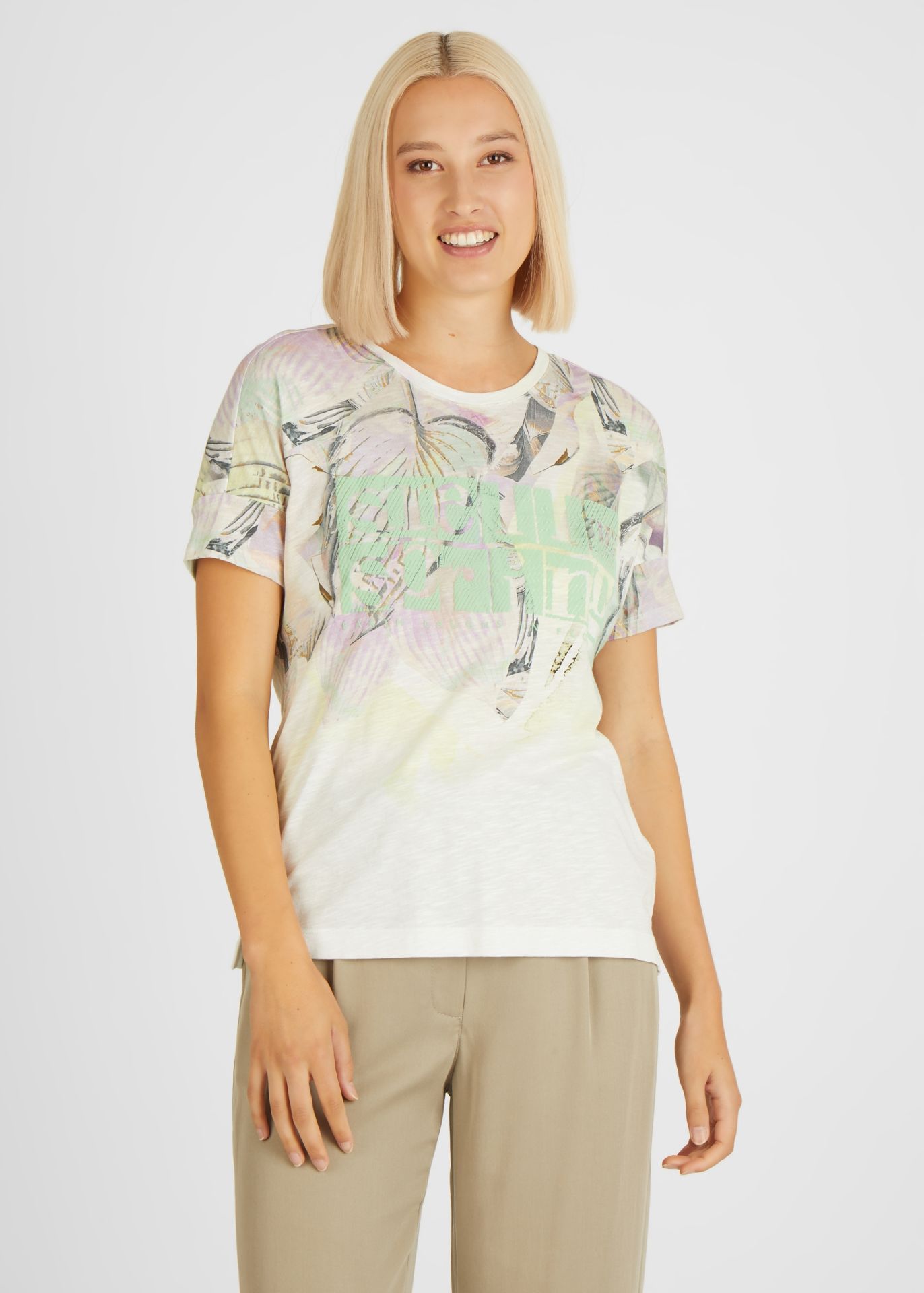 На сайте указаны российские размеры. Эта футболка с короткими рукавами сразу привлекает внимание своим экзотическим дизайном. Сплошной цветочный принт украшен яркими словами. Внутренний шов в размере 44: 62 см. Рост модели 176 см