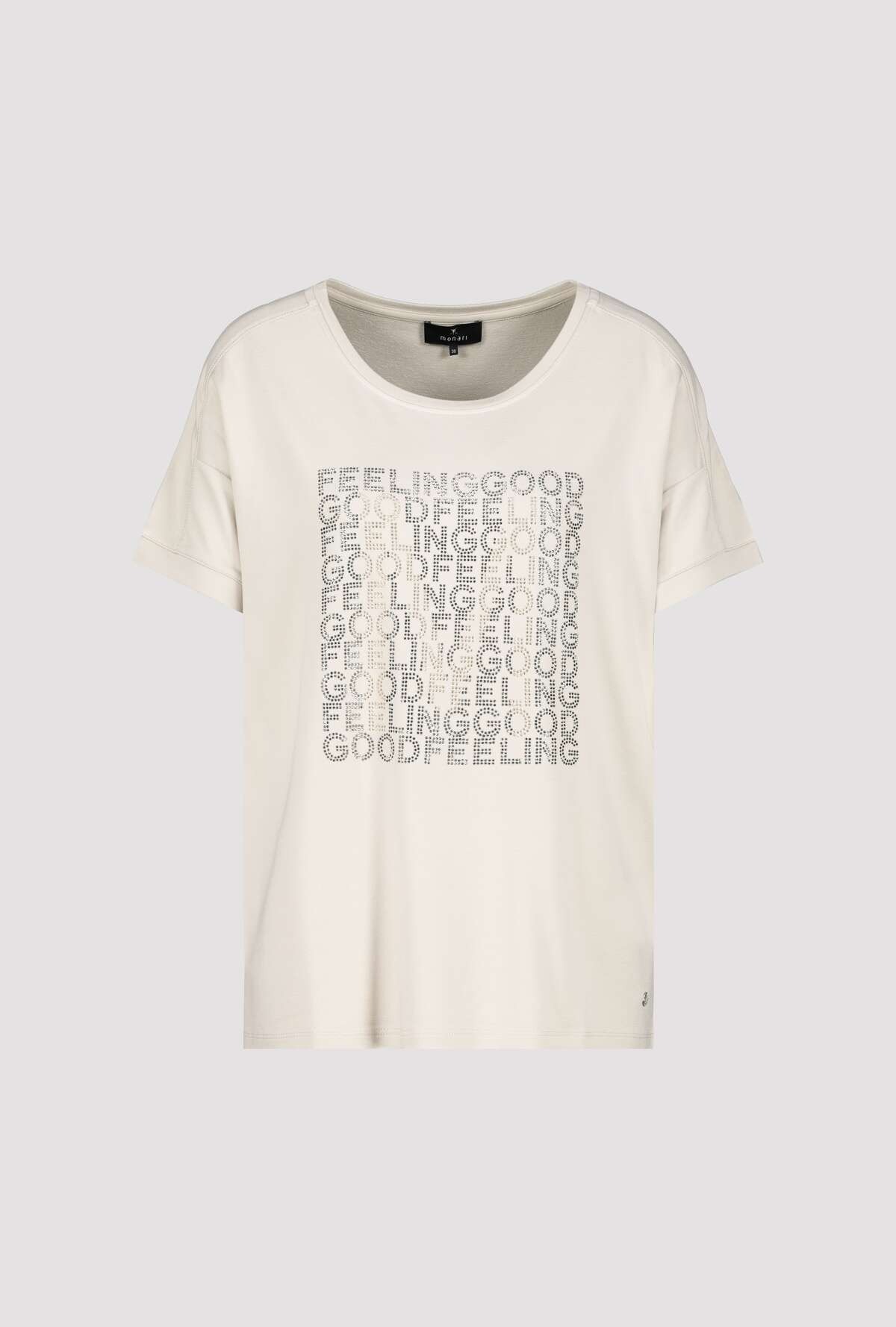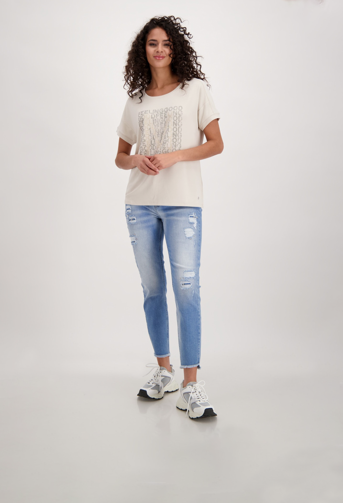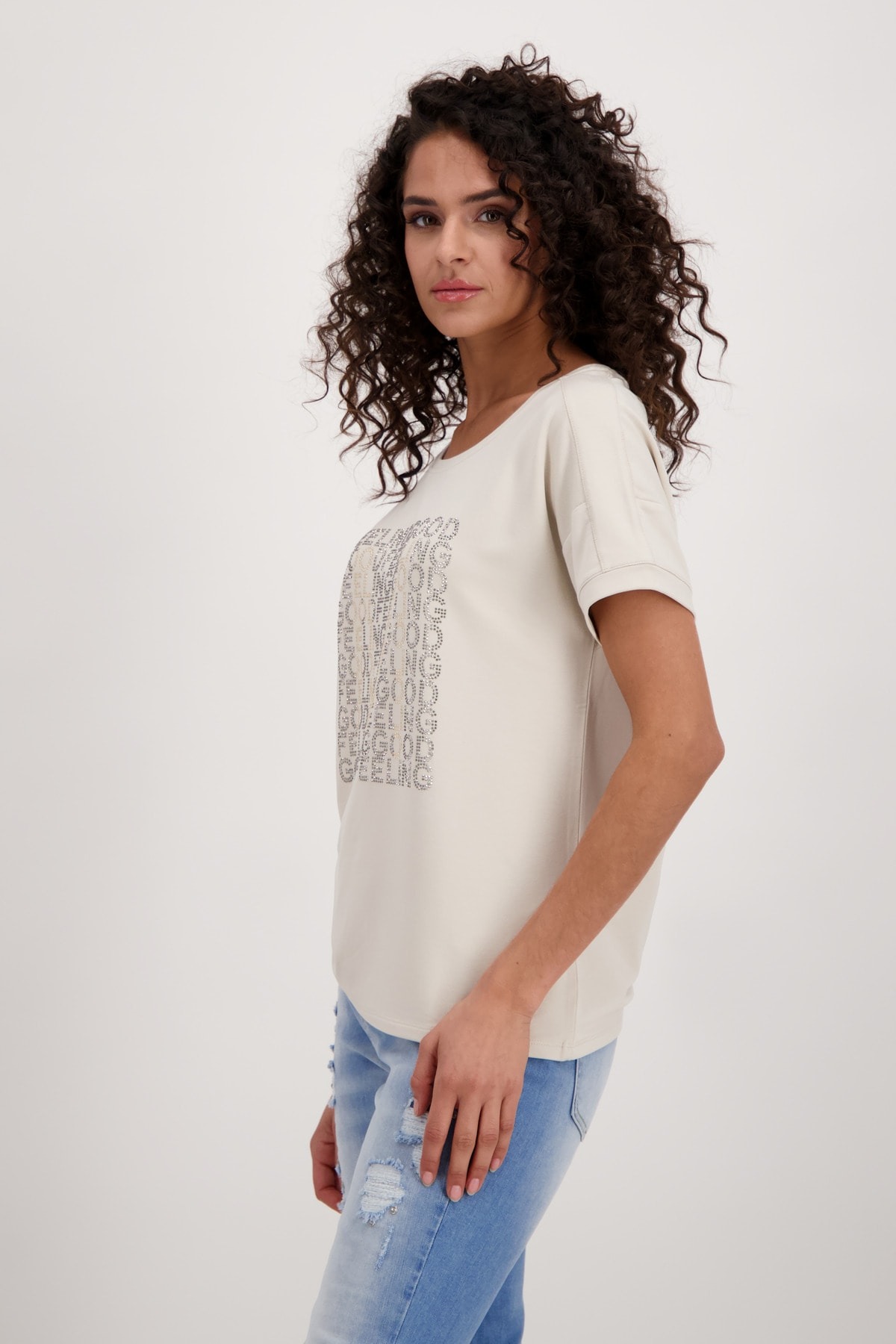 На сайте указаны российские размеры. Футболка со сверкающей надписью из страз привлекает всеобщее внимание. Покрой вдохновляет на классический крой с круглым вырезом горловины, полурукавами и манжетами на кромке рукава. Верх с блестками — всегда лучший выбор, он умело украсит любой наряд в стиле смарт-кэжуал. Длина в размере 44: 64 см. Рост модели 177 см.