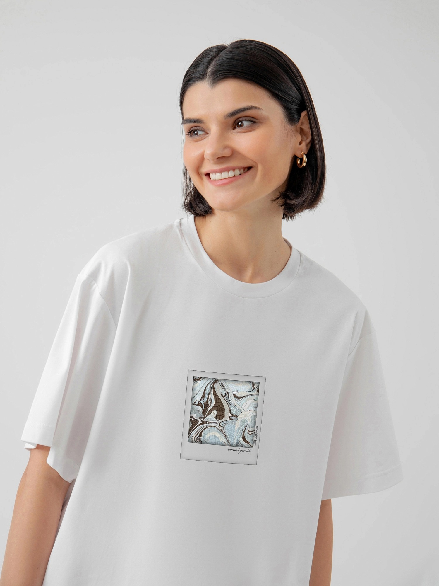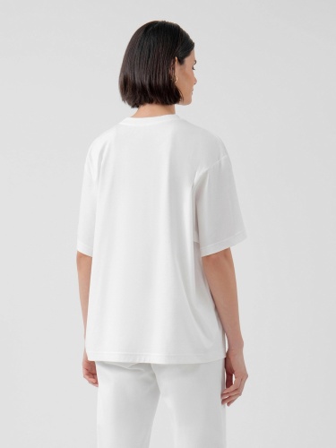На сайте указаны российские размеры. Базовая женская футболка свободного кроя белого цвета с принтом, короткими рукавами и круглой горловиной. Благодаря мерсеризации данная футболка имеет: - повышенную прочность и гигроскопичность - глубокий цвет - особенный блеск и гладкость - однородность волокон нити и высокое качество ткани. Рост модели 175 см.