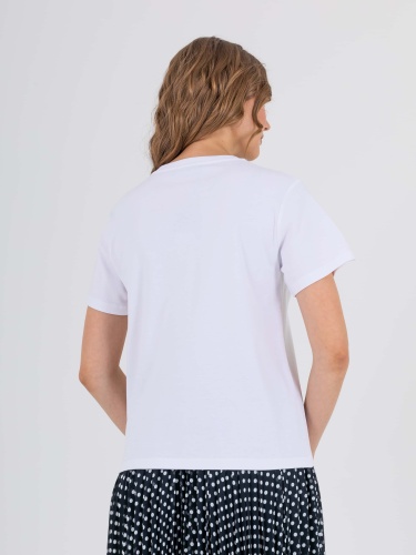 Футболка средней длины прямого силуэта из легкого хлопка. По переду выполнена нежная вышивка пайетками. Укороченные втачные рукава. Круглый вырез горловины.
