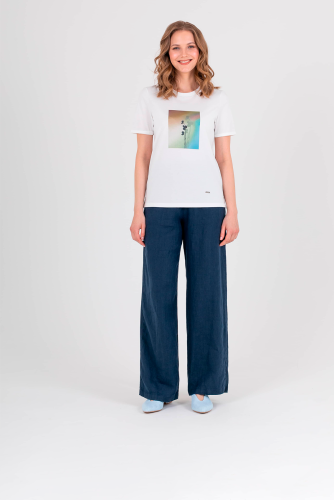 Футболка средней длины прямого силуэта из легкого 100% хлопка с разрезами в боковых швах. По переду выполнен нежный растительный принт. Укороченные втачные рукава. Круглый вырез горловины.