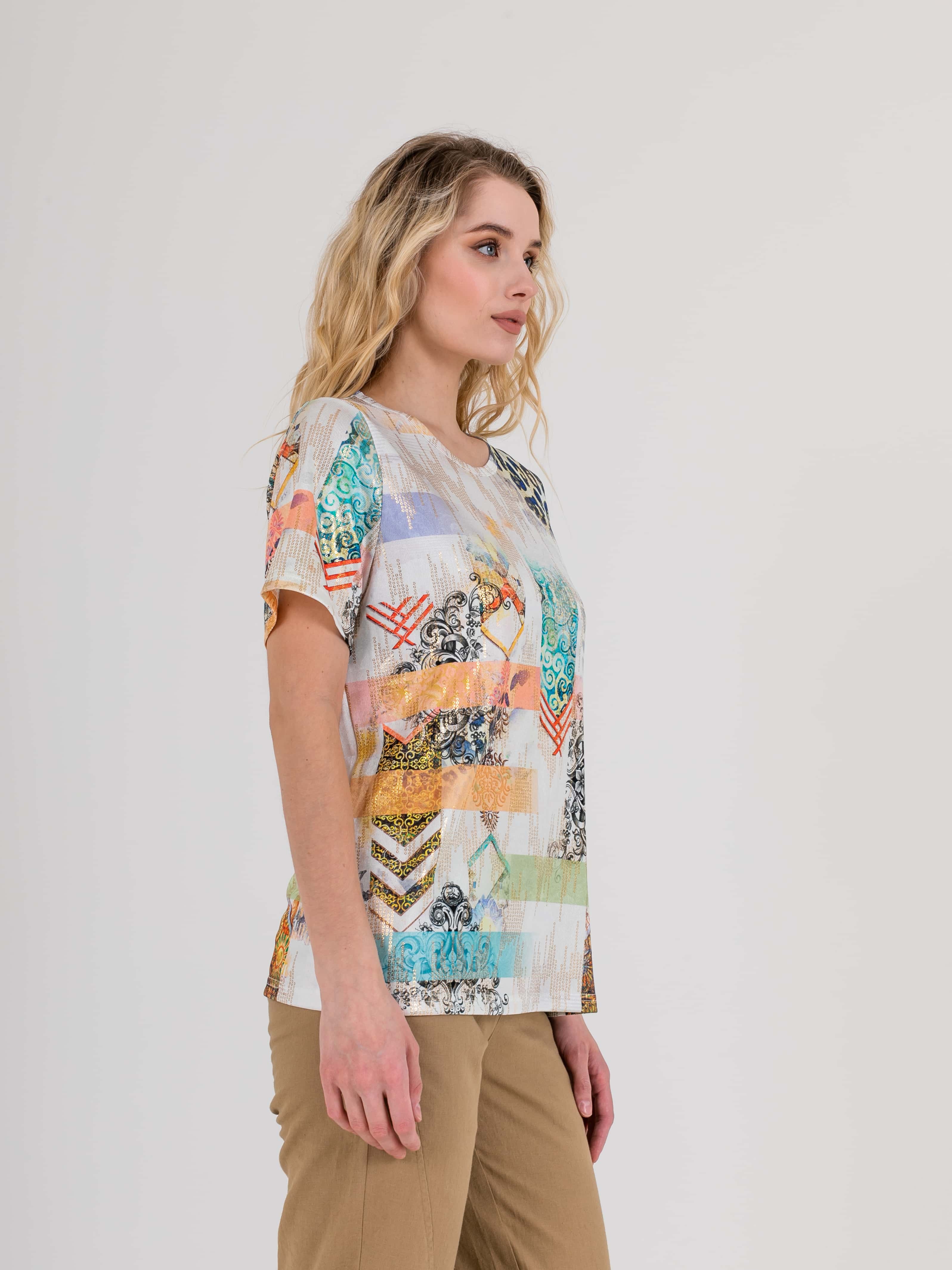Футболка средней длины прямого силуэта из полиэстера с добавлением эластана, дизайнерская особенность модели – эффектный принт в восточном стиле с имитацией пайеток. Укороченные втачные рукава. Круглый вырез горловины.
