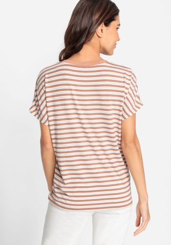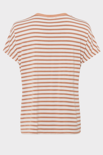 Прекрасная струящаяся драпировка из вискозы с тонким золотым люрексом придает классическим полоскам нотку дневного гламура. Модель с v-образным вырезом и рукавами «летучая мышь».