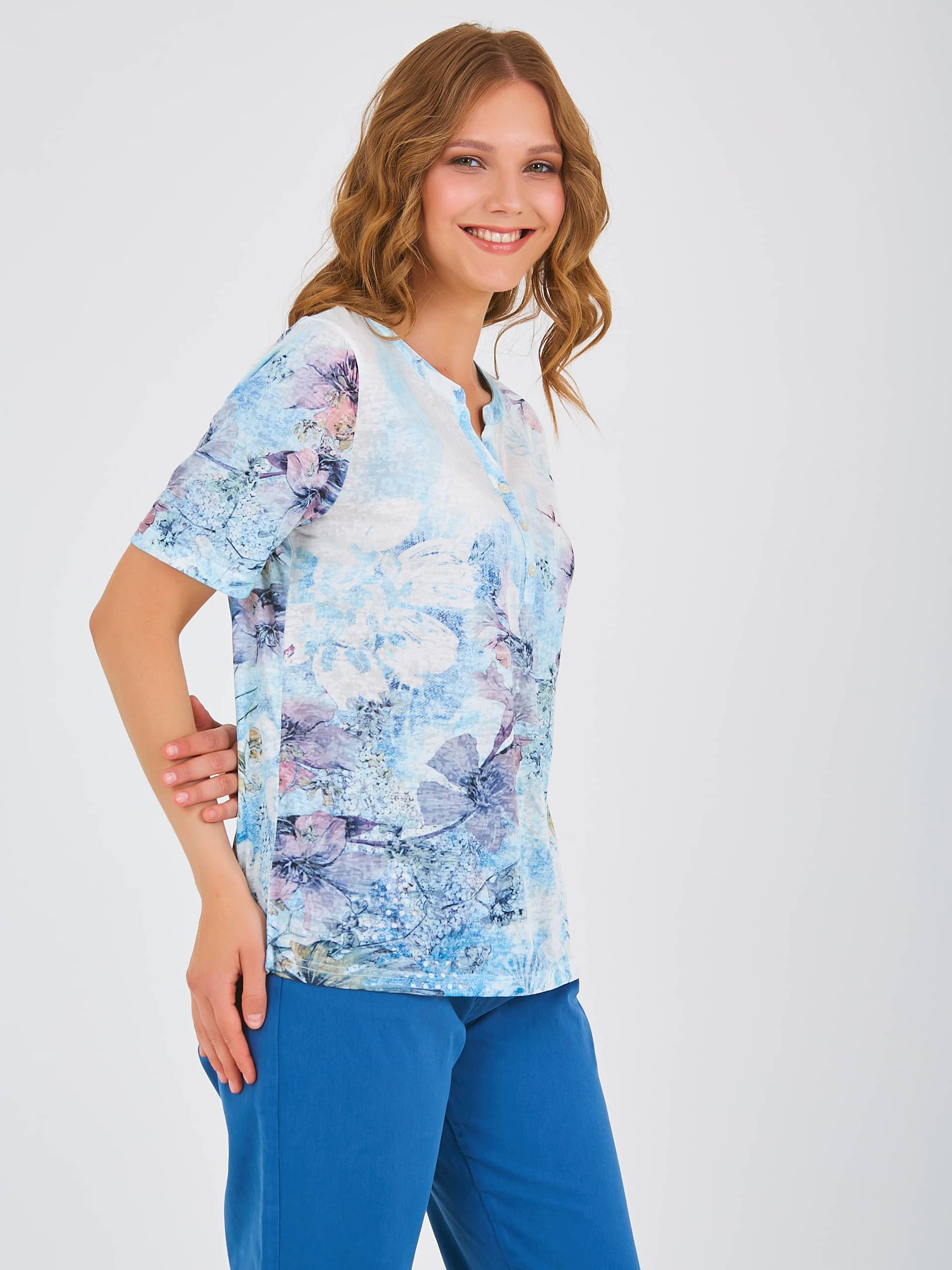 Футболка средней длины прямого силуэта из полиэстера с добавлением мягкой вискозы, дизайнерская особенность модели – тропический принт и фактурный трикотаж. Укороченные втачные рукава. Круглый вырез горловины с разрезом и планкой на три прорезные петли и пуговицы.