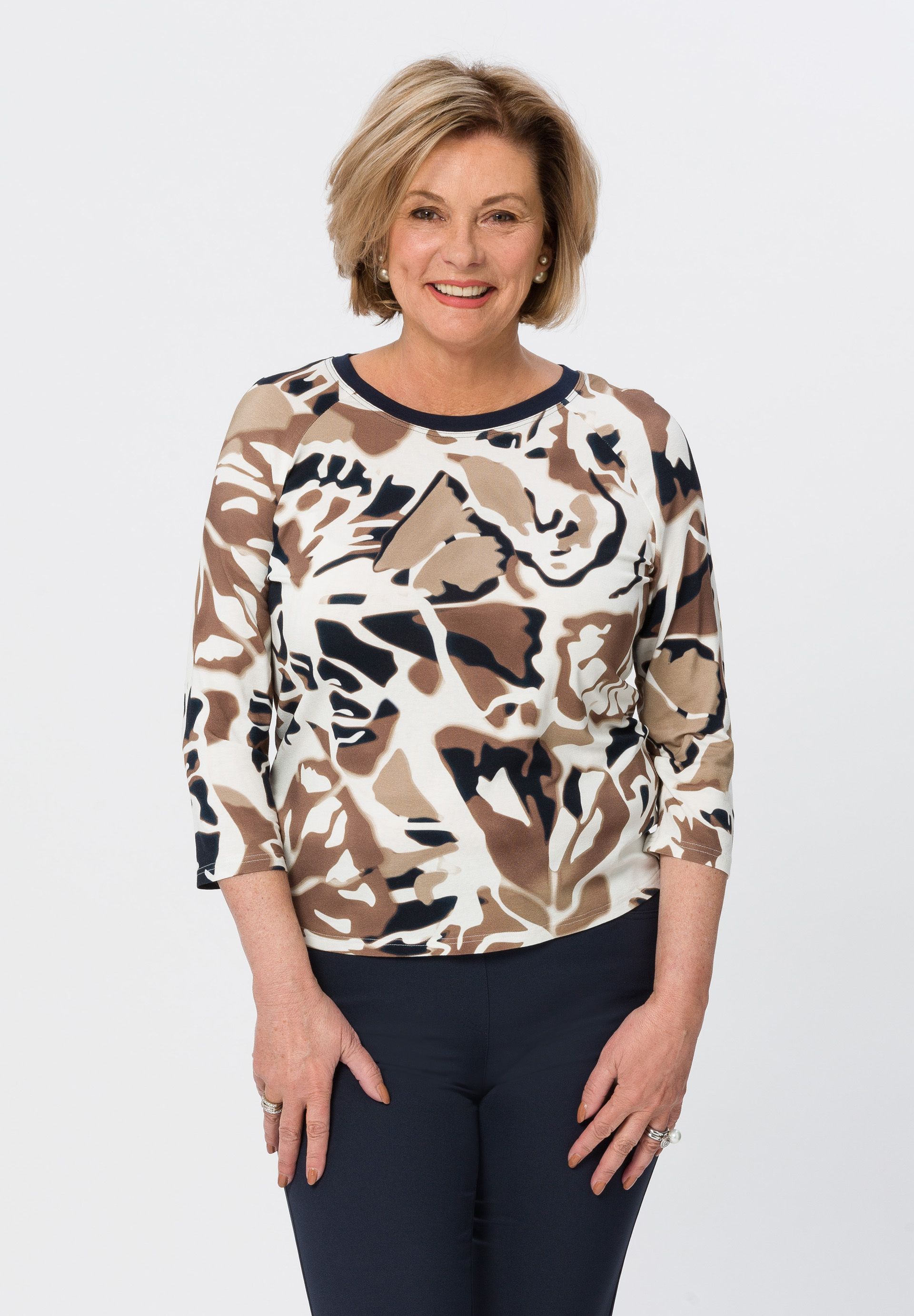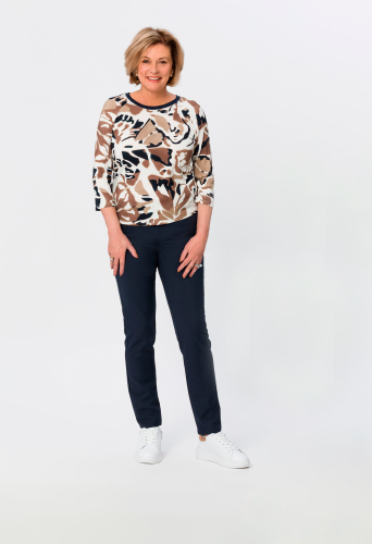 Современная футболка с женственным оттенком. Привлекательный принт и изящно отделанный вырез горловины придают этому стилю непринужденный вид. С модными рукавами реглан длиной 3/4.