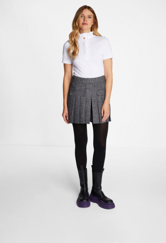 Футболка изготовлена из экологически чистого материала, имеет планку на пуговицах с рюшами и воротник с оборками из тканого хлопка. Трикотажный материал облегает фигуру. Длина для размера 42: 58 см. Окружность груди для размера 42: 82 см.