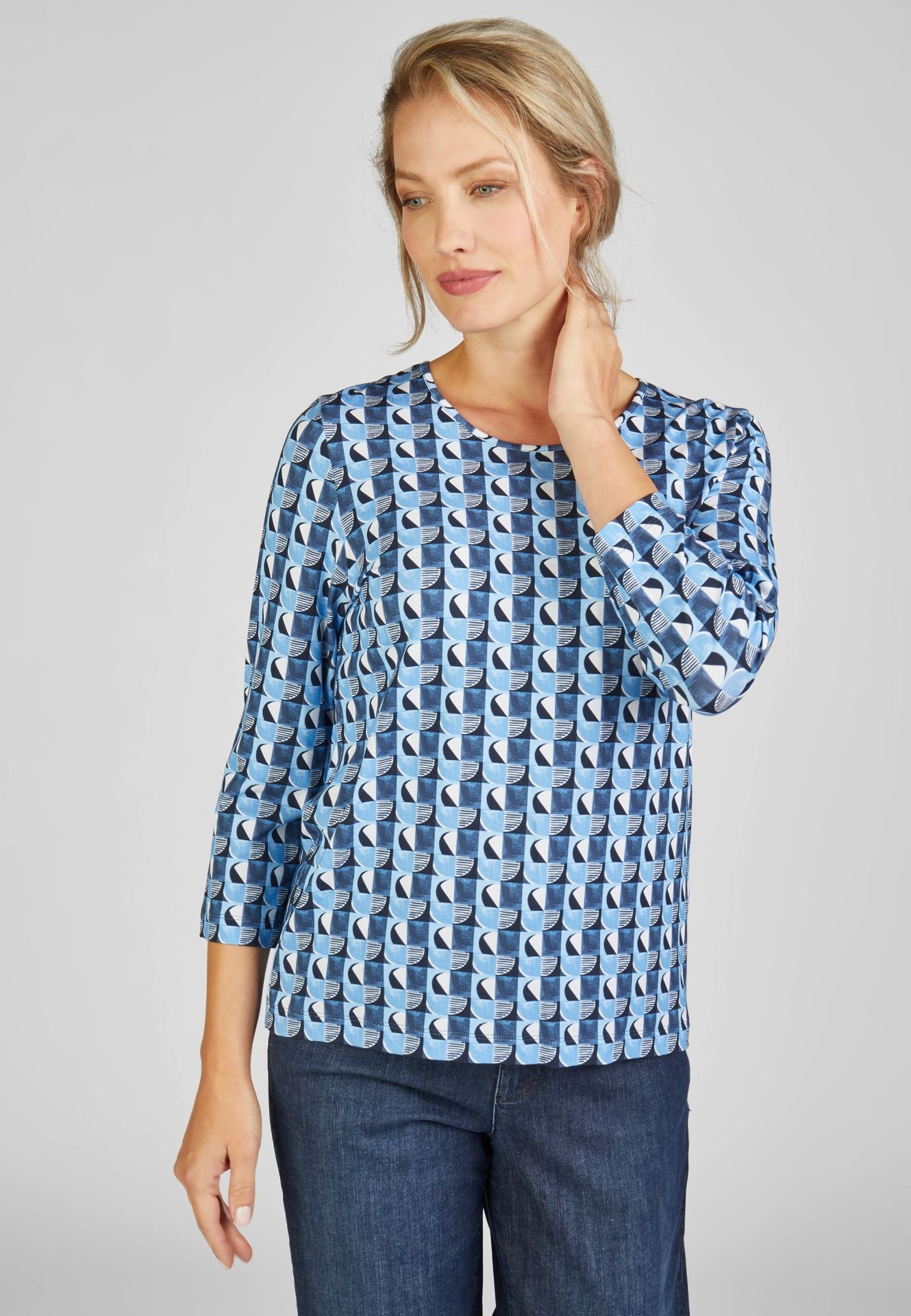 Футболка с рукавами 3/4 впечатляет стильным узором в клетку различных оттенков синего, подчеркнутым белыми бликами. Длина спинки от плеча для 44 размера: 62 см.