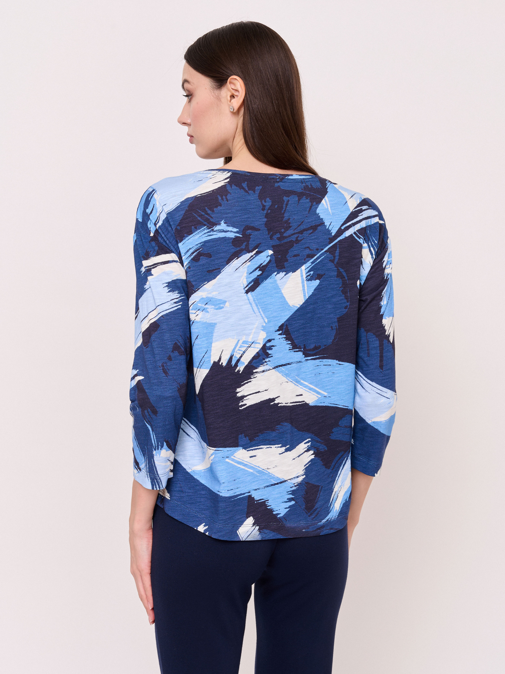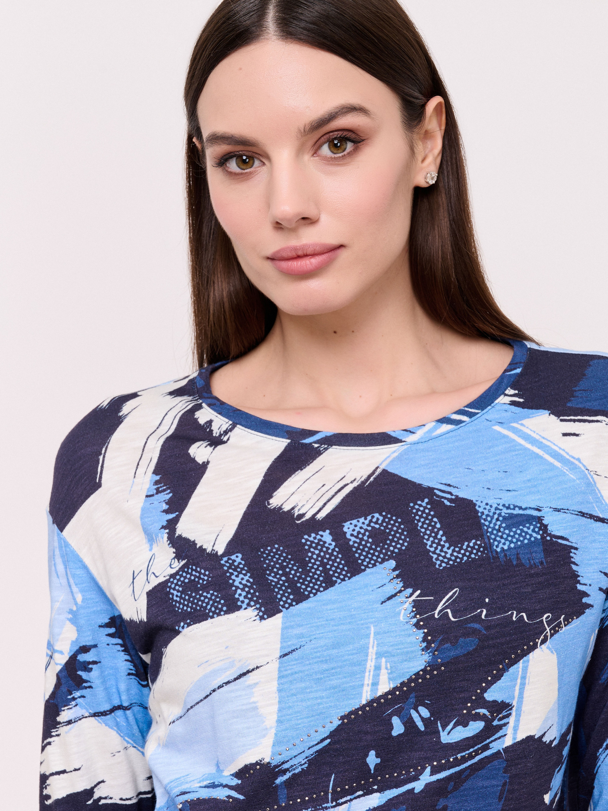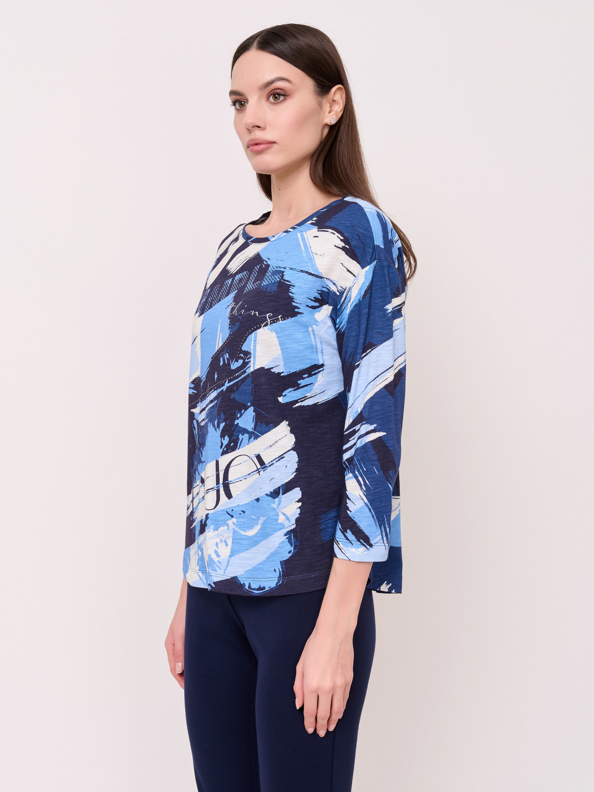 Детали: вырез горловины округлый, рукава 7/8, покрой прямой, рисунок абстракция, стразы. Длина по спинке: 58 см.