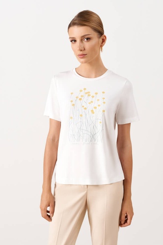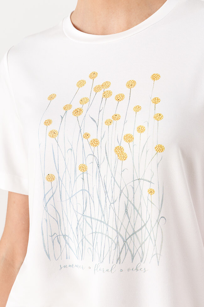 Классическая футболка прямого силуэта, выполнена из приятного вискозного полотна. Округлый вырез горловины. Короткие рукава. Спереди выполнен дизайнерский принт «Полевые цветы», декорированный стразами.