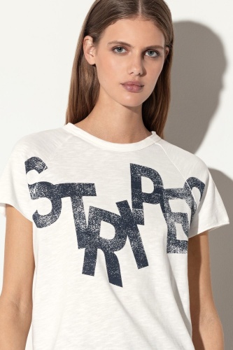 Футболка спортивного стиля повседневного силуэта с короткими рукавами реглан. Дизайн дополнен привлекательной надписью спереди и слегка закругленными краями.