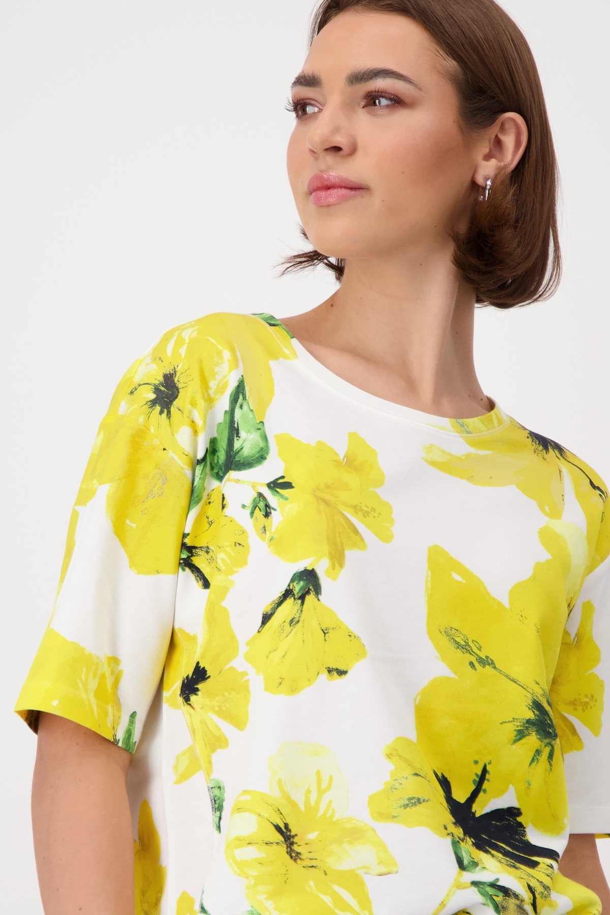 Футболка с цветочным принтом по всей поверхности изготовлена из высококачественной смеси хлопка и создает свежий и женственный образ. Регулярная посадка. Круглый вырез. Короткий рукав. Удлиненная закругленная спина. Длина спинки 44-го размера составляет 65 см, длина переда 62 см.