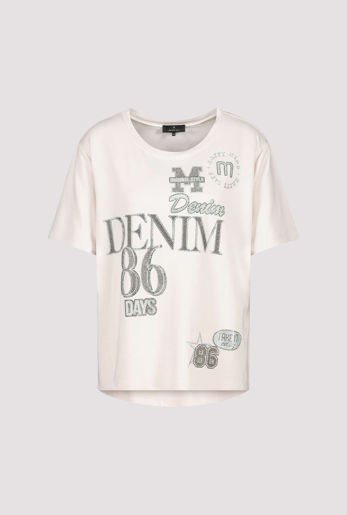 Стильная футболка из струящейся смесовой вискозы, украшенная сверкающими надписями из страз. Регулярная посадка. Круглый вырез. Короткие рукава слегка внахлест. Предварительный боковой шов. Удлиненная, закругленная спина. Длина спинки 44-го размера составляет 63 см, длина переда 60 см.