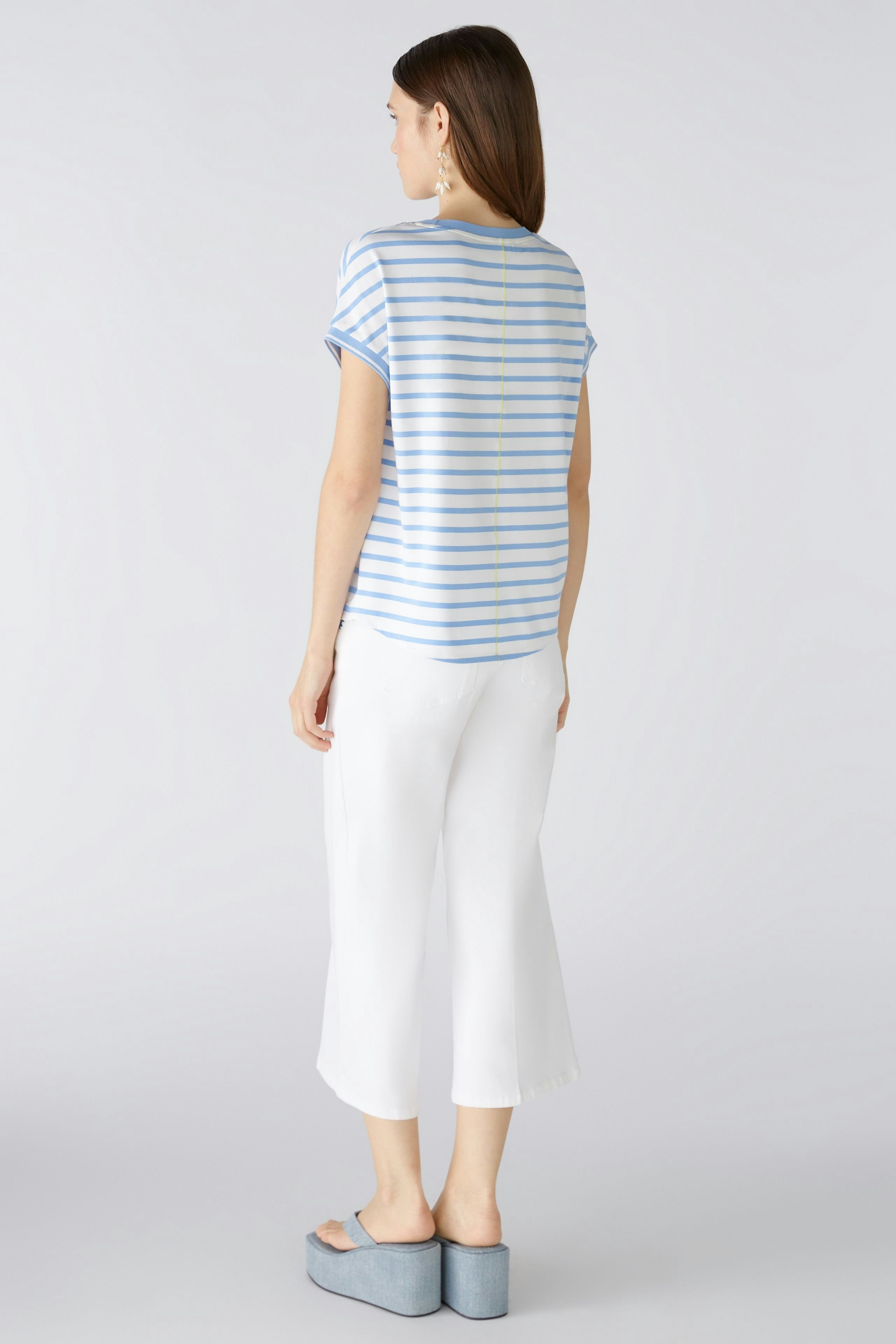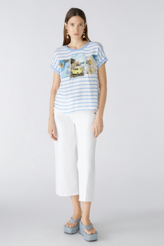 Футболка - легкая и воздушная - блузка подчеркивает фигуру спереди - удобный трикотаж сзади с летним принтом. Передняя часть из вискозной ткани, спинка из эластичного вискозно-хлопкового трикотажа. Повседневный крой, стандартная длина. Ребристые манжеты на горловине и рукавах. Вырез на плече, свободно ниспадает в короткие рукава. Закругленный низ, слегка расширенный сзади. Длина для размера 42: 64 см.