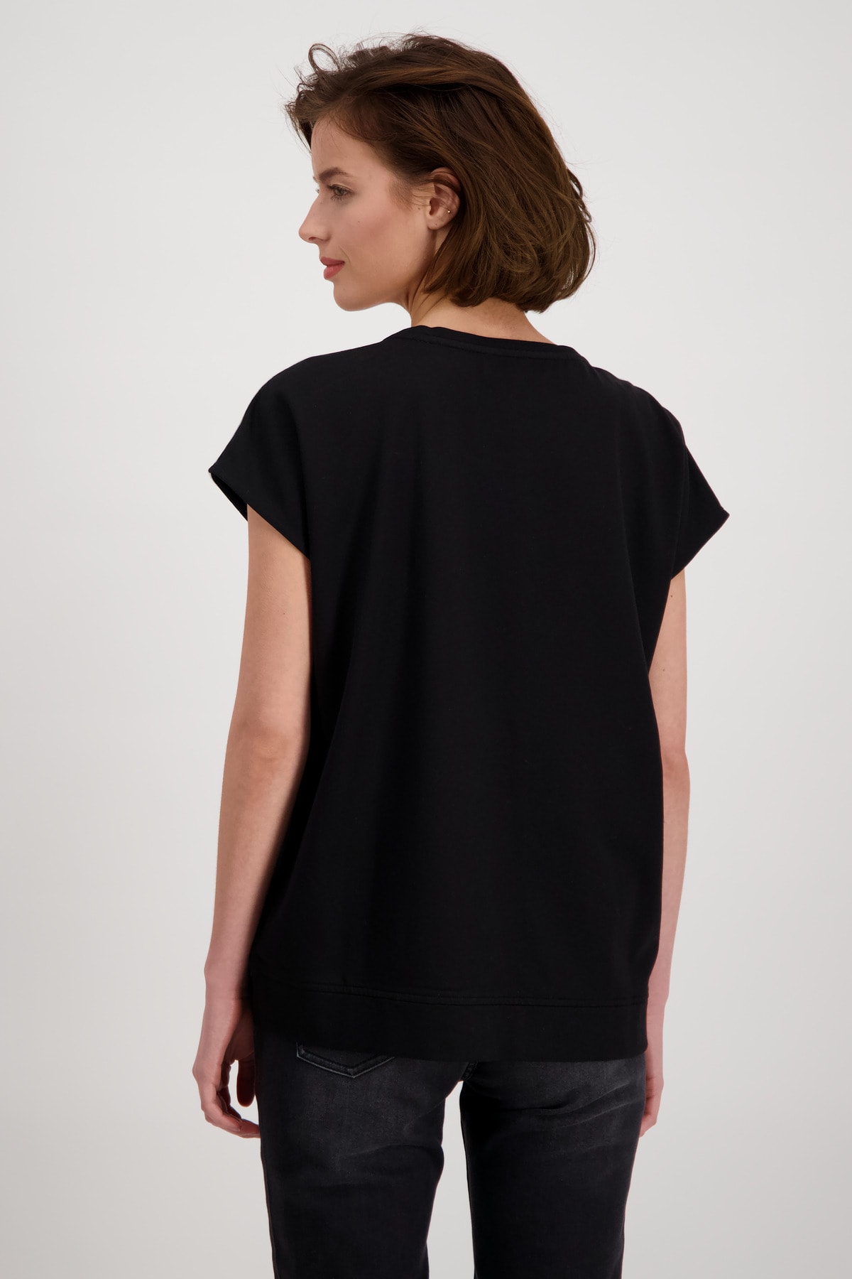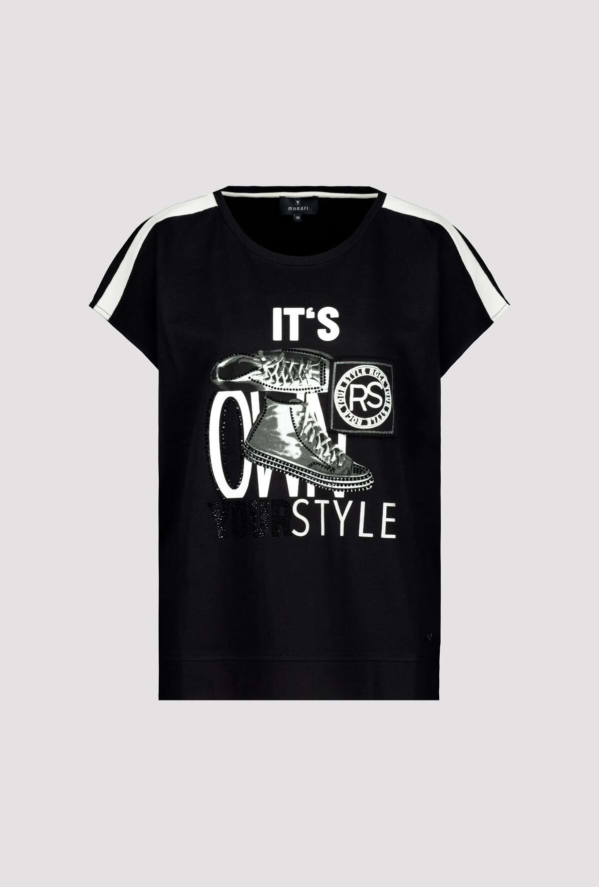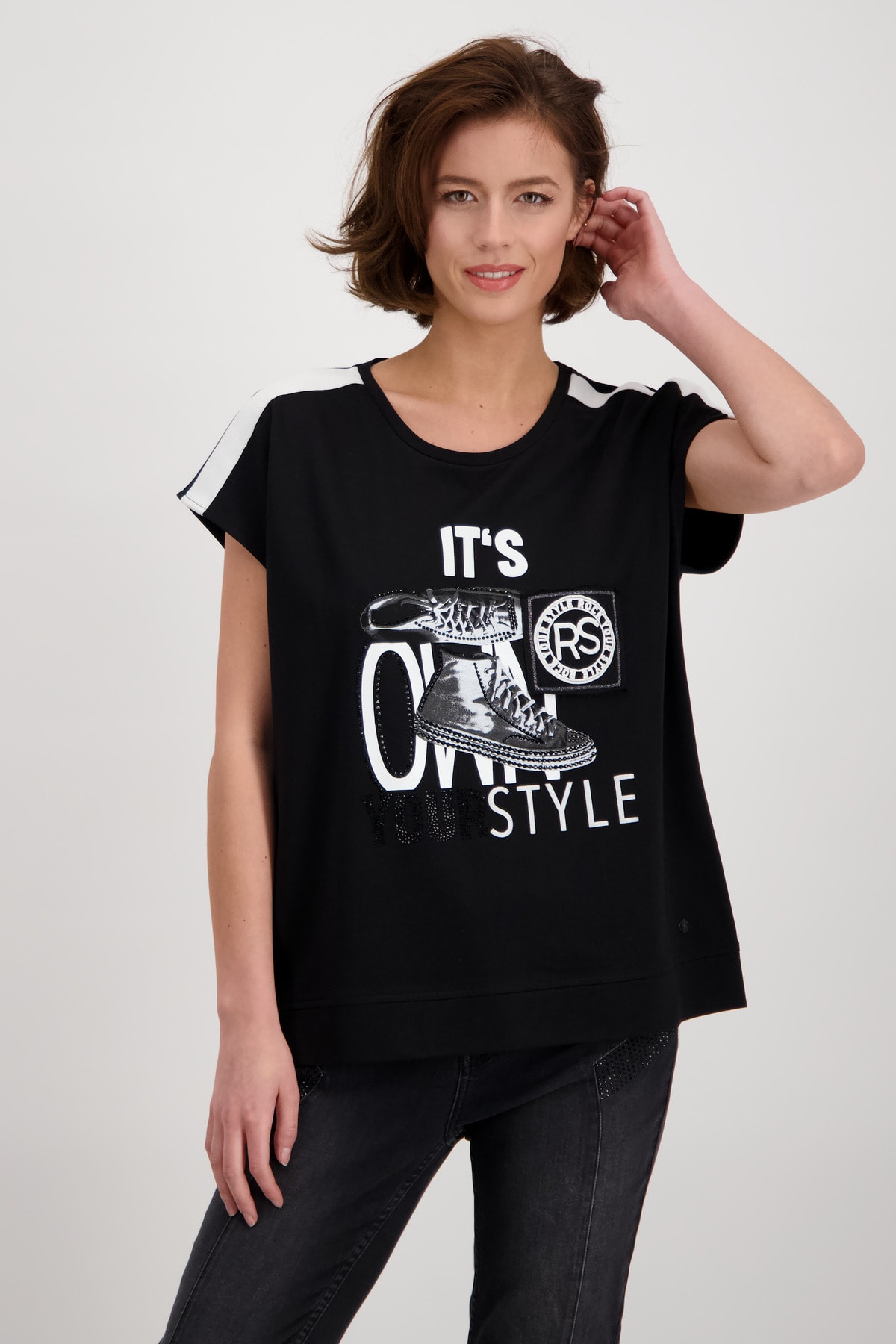 На сайте указаны российские размеры. Футболка из джерси с круглым вырезом, короткими рукавами и принтом. Модель прямого кроя с круглым вырезом горловины дополнена короткими рукавами большого размера и широким поясом по низу. Он становится изюминкой благодаря кокетке на плече с контрастной тесьмой, нашивке с блестками и эмблемой с объемными буквами, а также принту обуви с контрастной объемной надписью и сверкающими стразами. Сочетание хлопка и модала также обещает комфорт высокого качества. Носите его со стильными джинсами со стразами в тон, и образ будет более чем модным. Рост модели: 179 см. Длина по спине: 64 см.