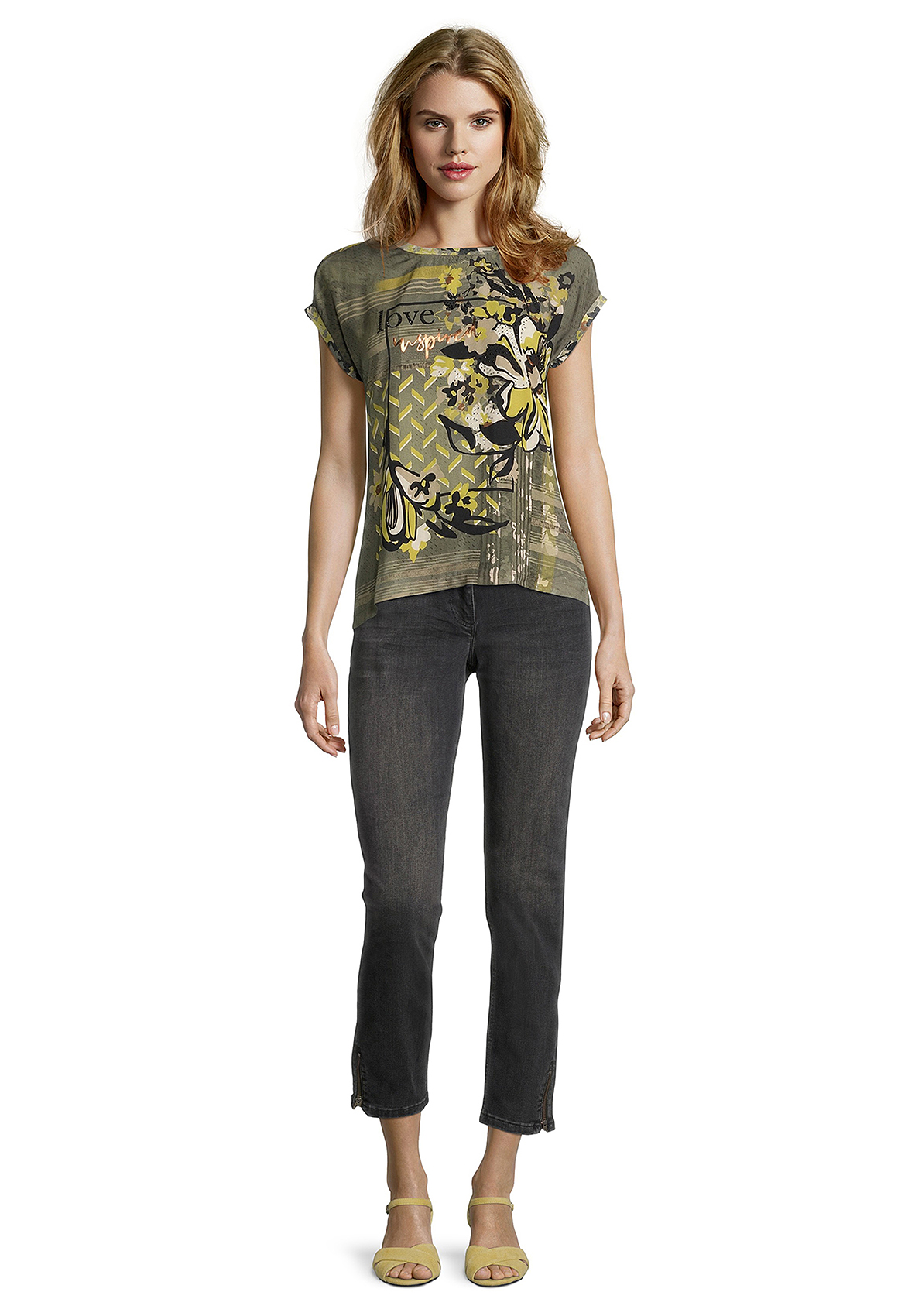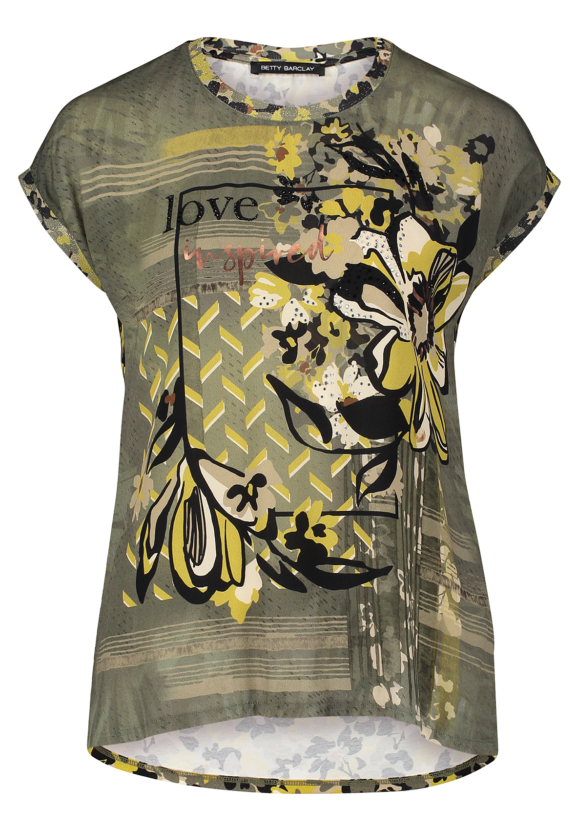 Эта футболка обращает на себя внимание эклектичным принтом с цветочными мотивами. Металлизированные элементы придают легкий блеск. Другие особенности дизайна - свободный покрой, вырез горловины "лодочка", короткие цельнокроеные рукава. Приятный к телу материал из вискозной смеси обеспечивает комфорт.