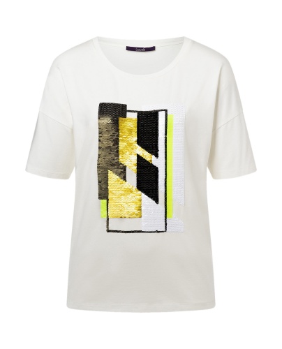 Футболка прямого покроя. Круглый вырез горловины, короткие рукава со спущенным плечом. Декор пайетками. Приятный к телу материал из смеси хлопка, модала и эластана обеспечивает комфорт.