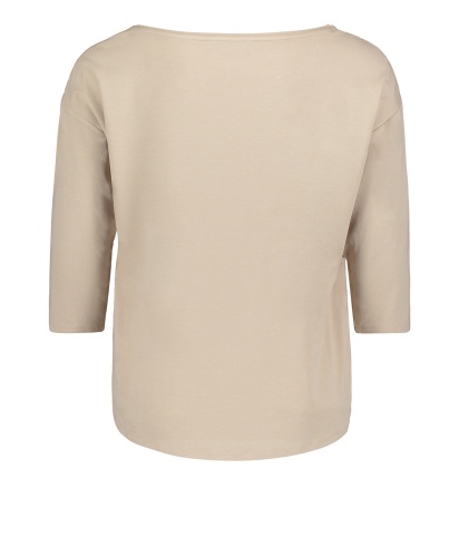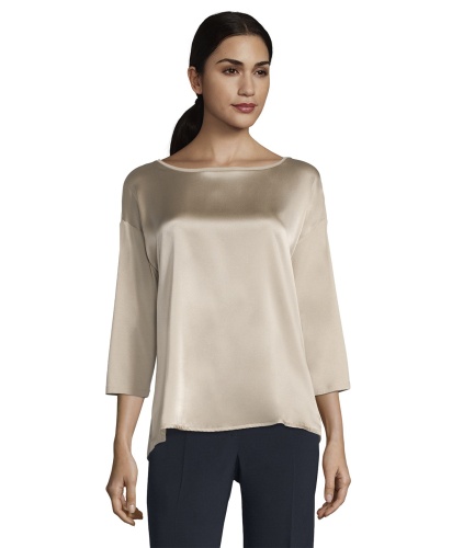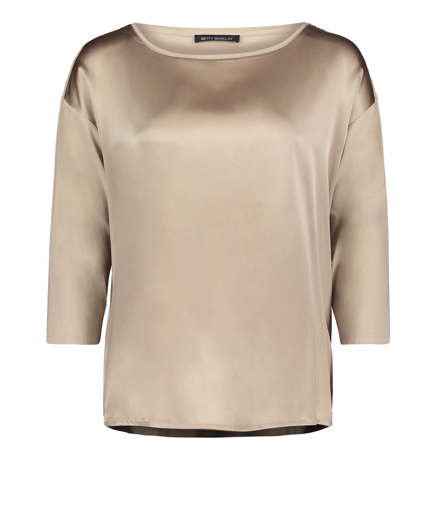 Футболка свободного покроя. Круглый вырез горловины, рукава 3/4 со спущенным плечом. Материал из вискозной смеси приятен к телу и обеспечивает комфорт. Блестящий материал переда футболки придает модели элегантный вид. Однотонная футболка является базовой вещью, поэтому отлично сочетается с любыми элементами гардероба.