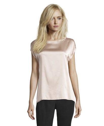 Однотонный топ - базовая модель, которая является обязательной вещью в любом гардеробе. Топ прямого покроя с вырезом-лодочкой и короткими цельнокроеными рукавами. Блестящий атласный перед изделия контрастирует с матовой спинкой. Материал из смеси шелка и эластана обеспечивает комфорт и идеально подходит для теплого времени года. В этом лаконичном и элегантном топе вы будете выглядешь шикарно, независимо от выбранного варианта низа и обуви.