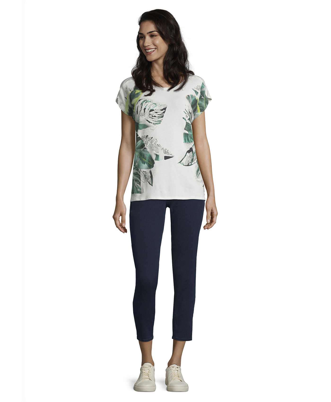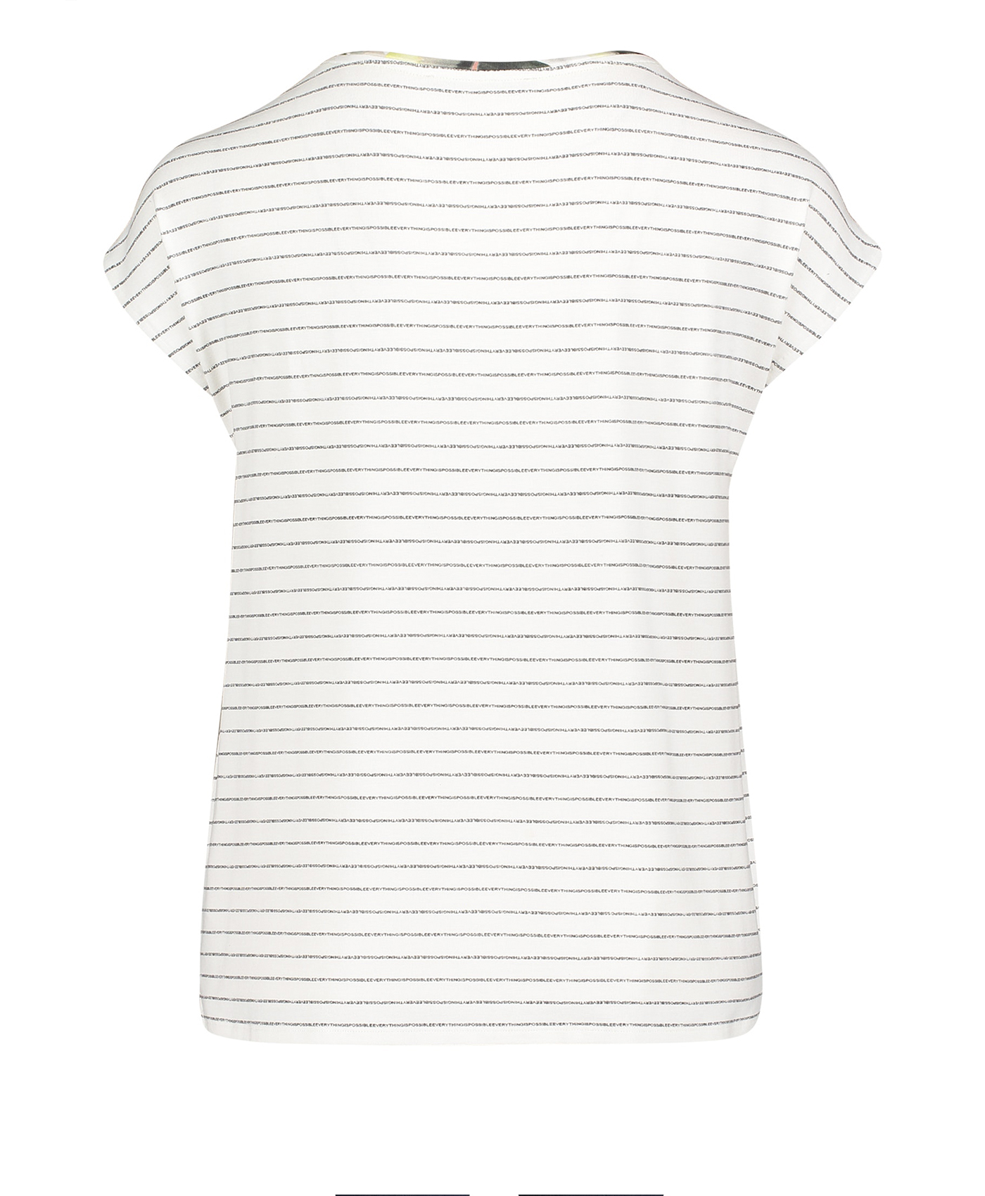 Футболка прямого покроя. Широкий круглый вырез горловины, короткие цельнокроеные рукава. Принт с надписью и трендовыми тропическими мотивами. Спинка изделия выполнена из материала с принтом в полоску. Приятный к телу материал из вискозной смеси. В сочетании как с брюками, так и с юбкой эта футболка создает стильный современный образ.